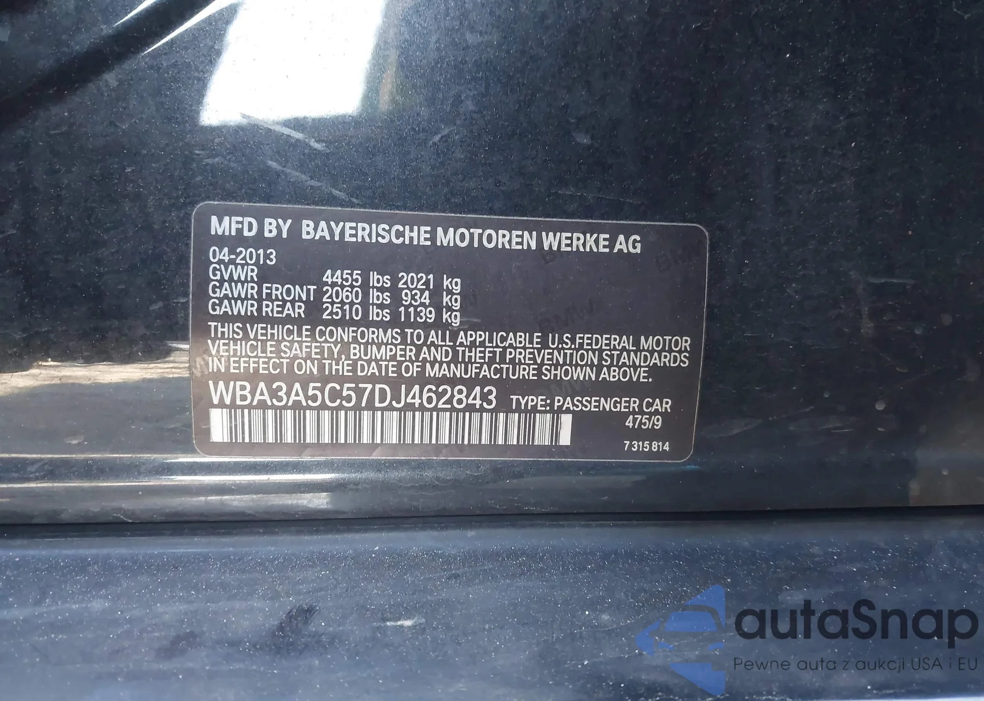 Samochód BMW 3er 2013 (VIN WBA3A5C57DJ462843) nie był wcześniej licytowany. Dokumenty są czyste, przebieg odpowiada lub jest niższy niż średnia rynku. Sprzedaje go firma ubezpieczeniowa – polecamy zakup. Dostawa do portu zajmie ok. 6–8 tygodni.