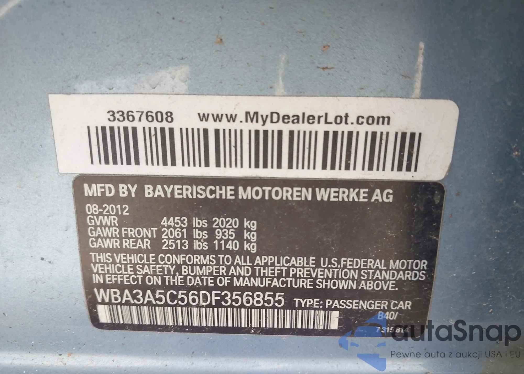 Samochód BMW 3er 2013 (VIN WBA3A5C56DF356855) nie był wcześniej licytowany. Dokumenty są czyste, przebieg odpowiada lub jest niższy niż średnia rynku. Sprzedaje go firma ubezpieczeniowa – polecamy zakup. Dostawa do portu zajmie ok. 6–8 tygodni.