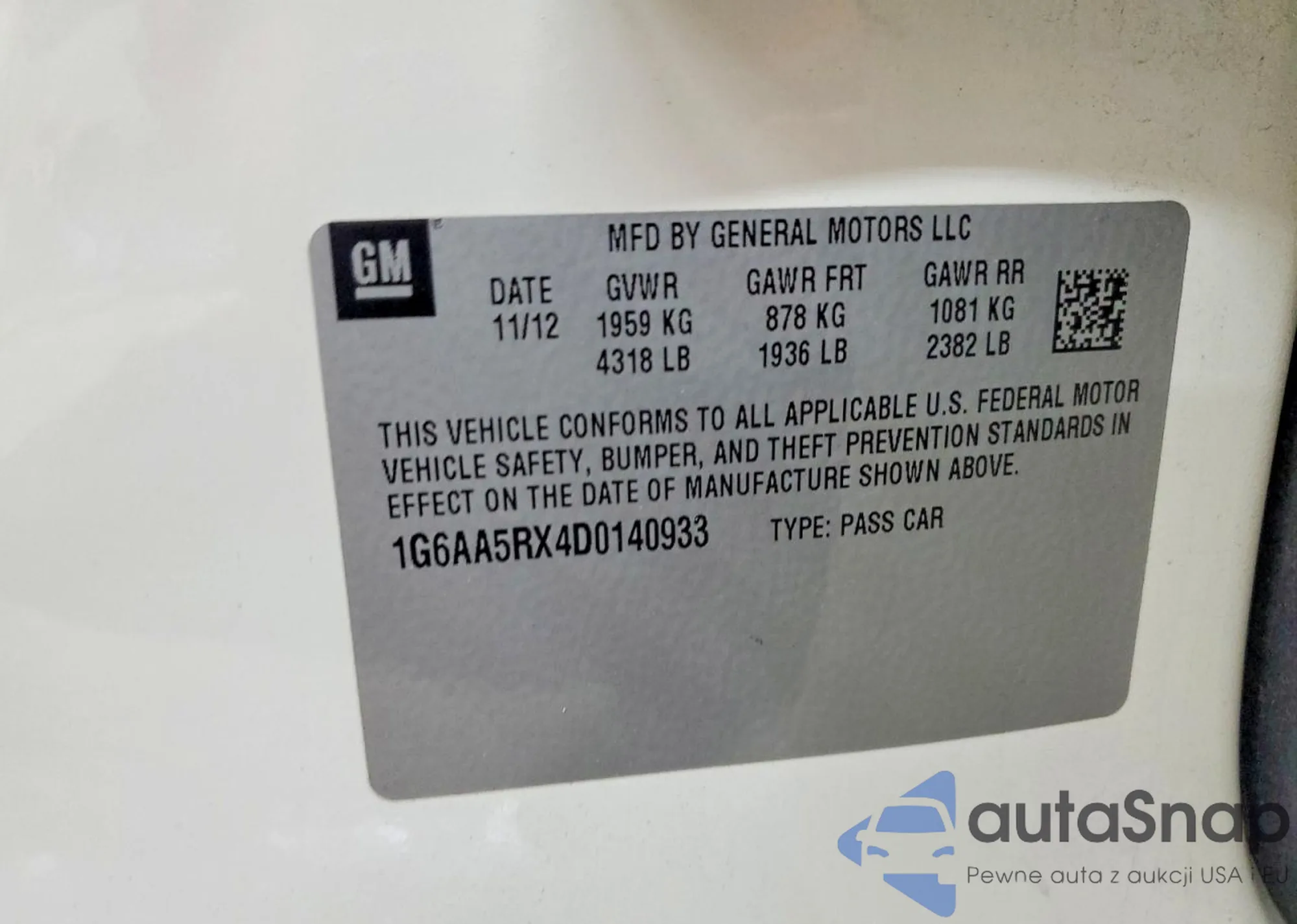 • VIN: 1G6AA5RX4D0140933
