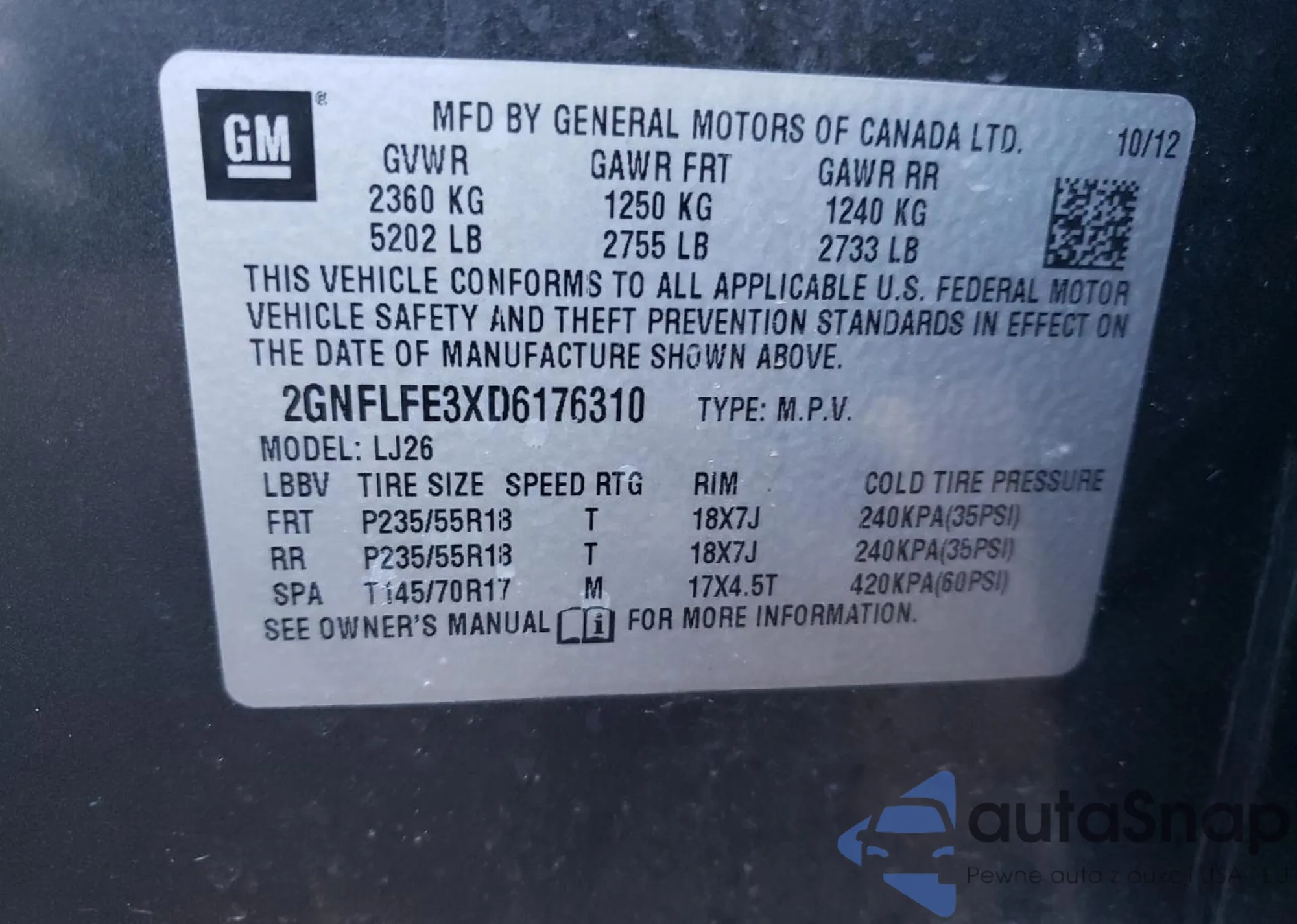 VIN: 2GNFLFE3XD6176310