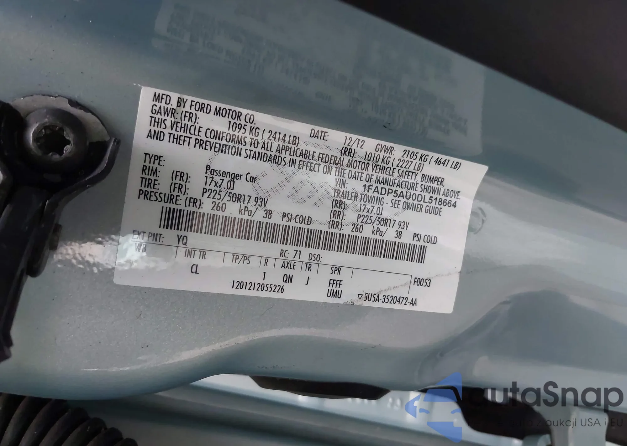 • VIN: 1FADP5AU0DL518664