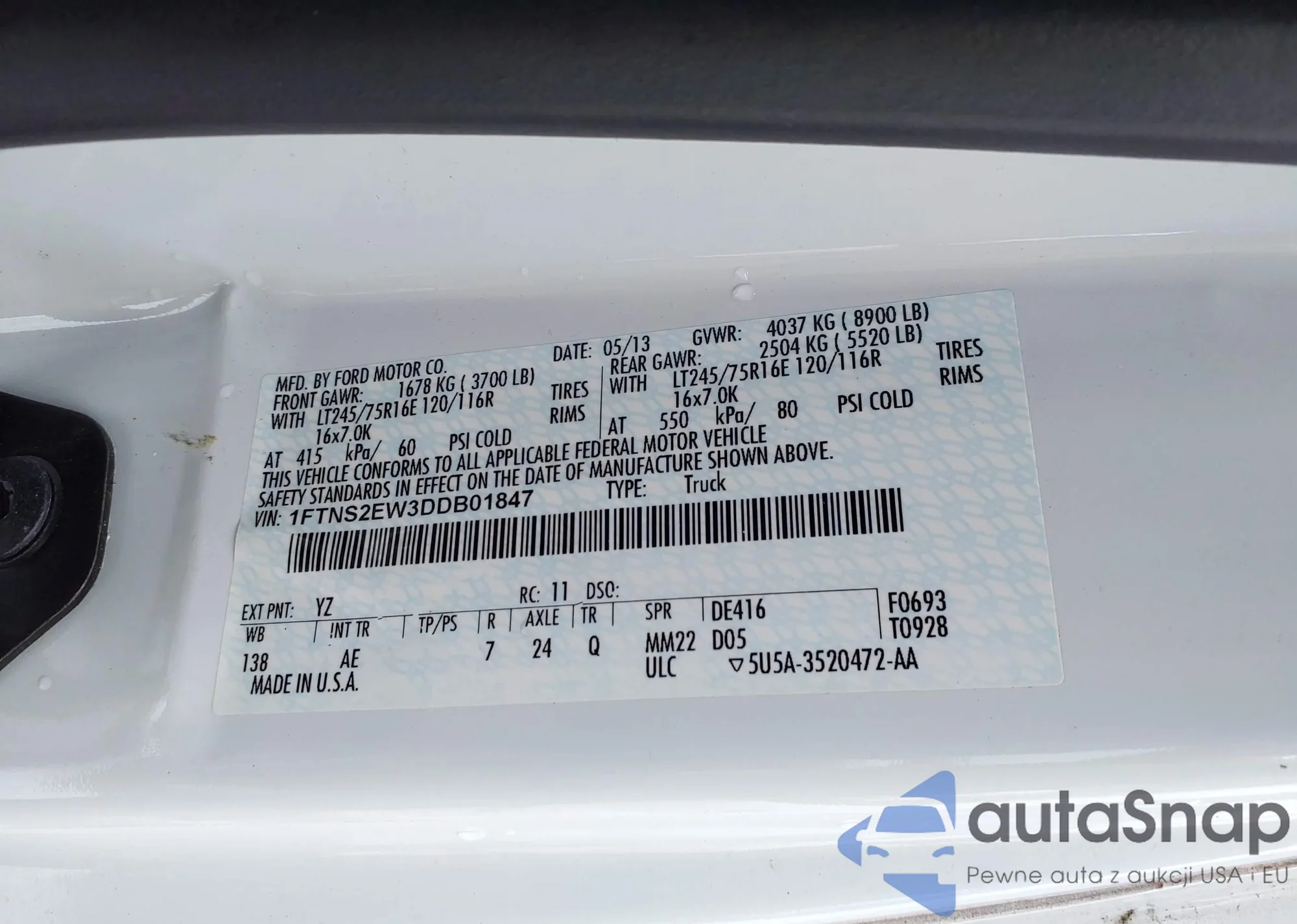 Samochód Ford Econoline 2013 (VIN 1FTNS2EW3DDB01847) nie był wcześniej licytowany. Dokumenty są czyste, przebieg odpowiada lub jest niższy niż średnia rynku. Sprzedaje go firma ubezpieczeniowa – polecamy zakup. Dostawa do portu zajmie ok. 6–8 tygodni.