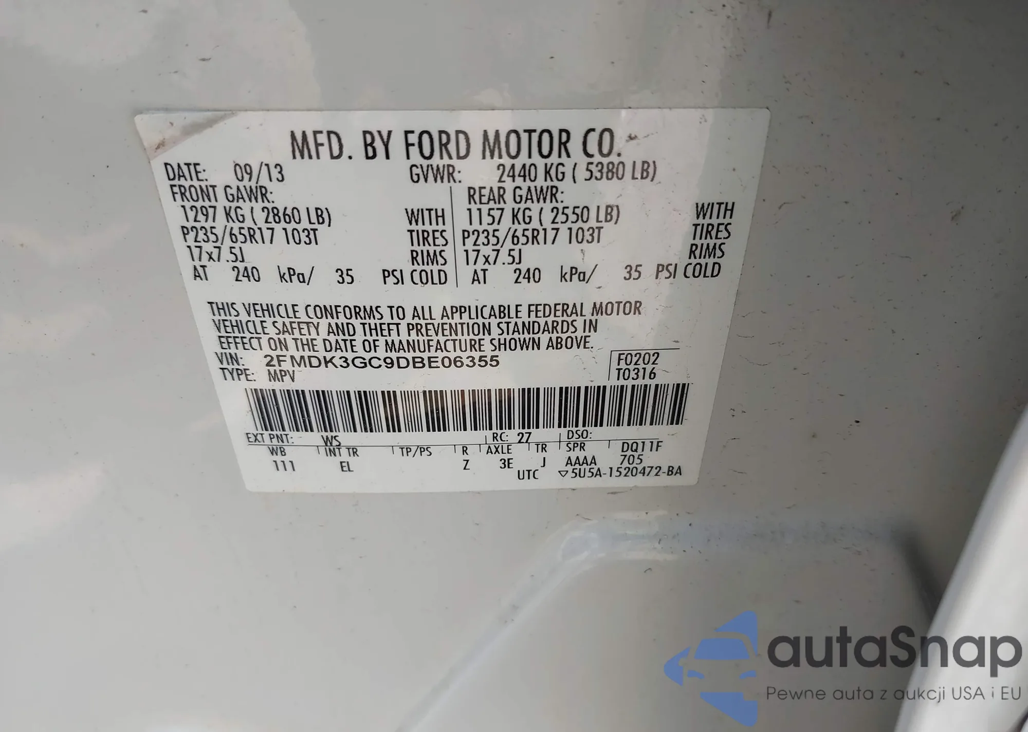 VIN: 2FMDK3GC9DBE06355
