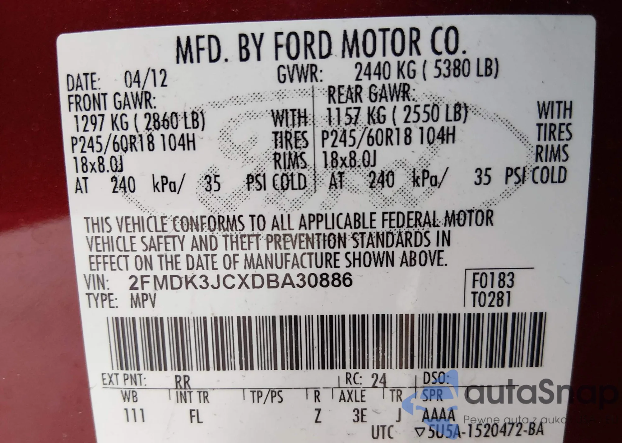 VIN: 2FMDK3JCXDBA30886