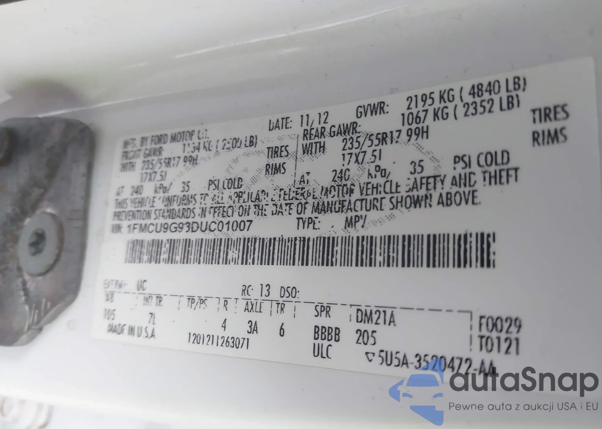VIN: 1FMCU9G93DUC01007