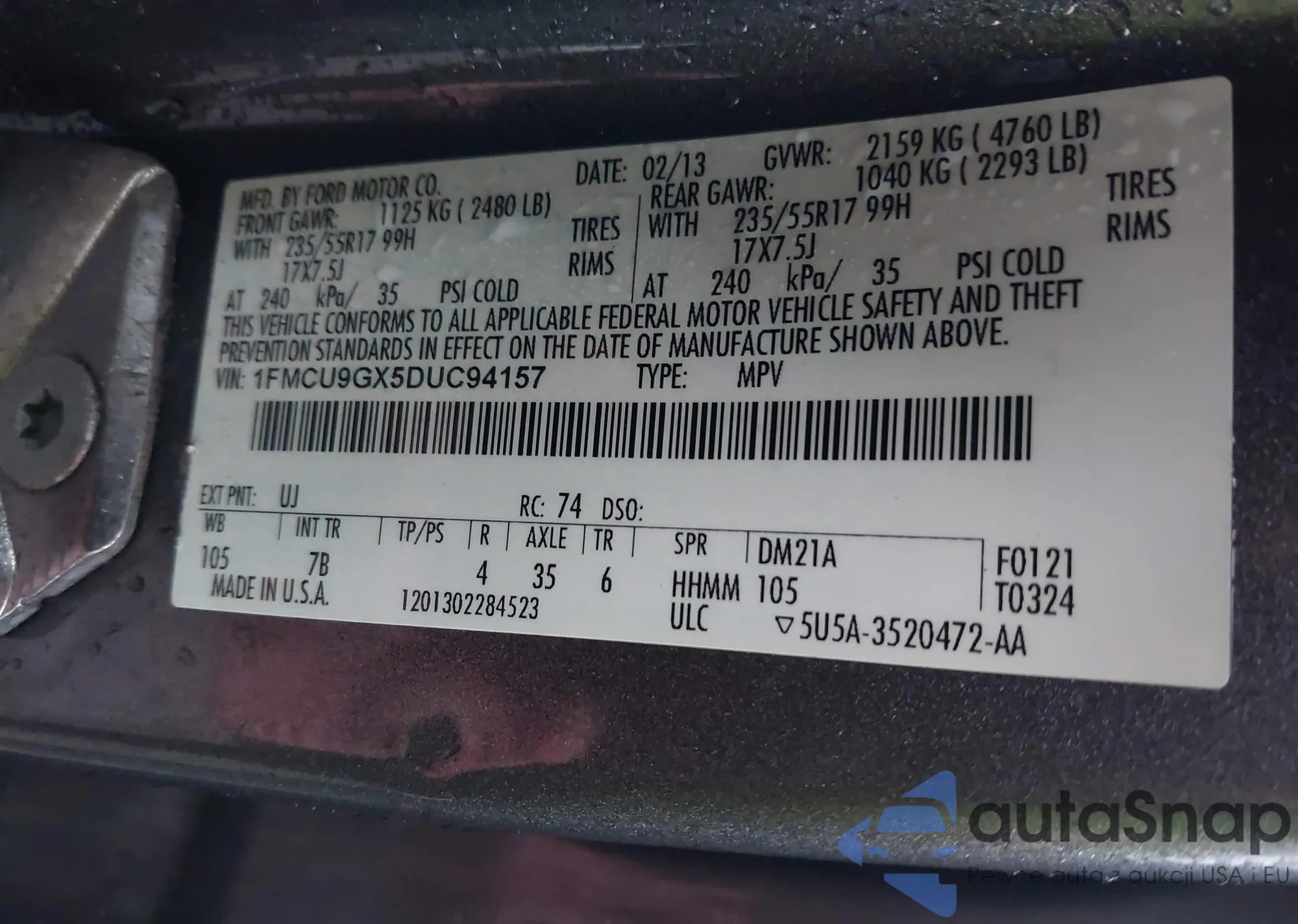 VIN: 1FMCU9GX5DUC94157