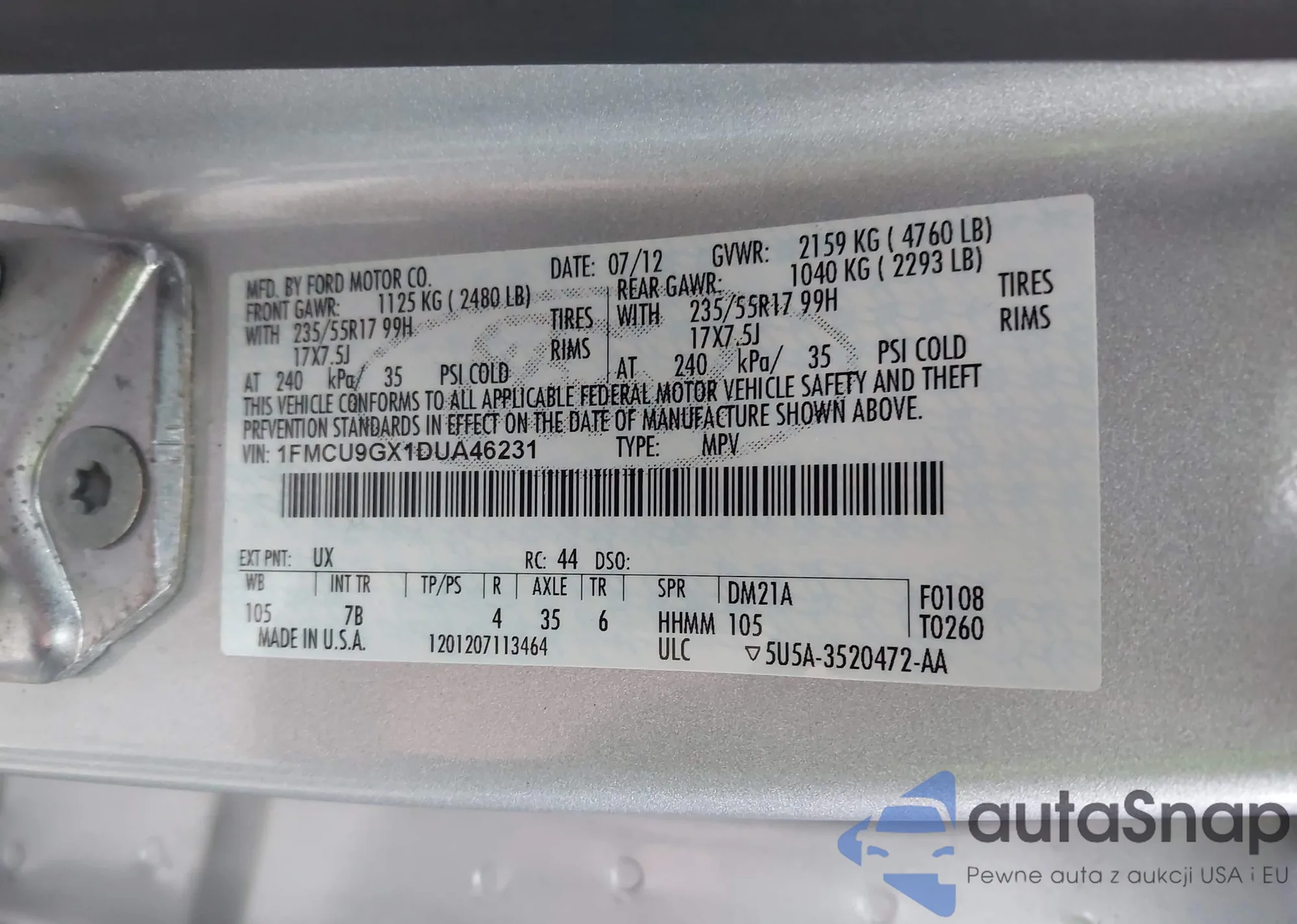 VIN: 1FMCU9GX1DUA46231