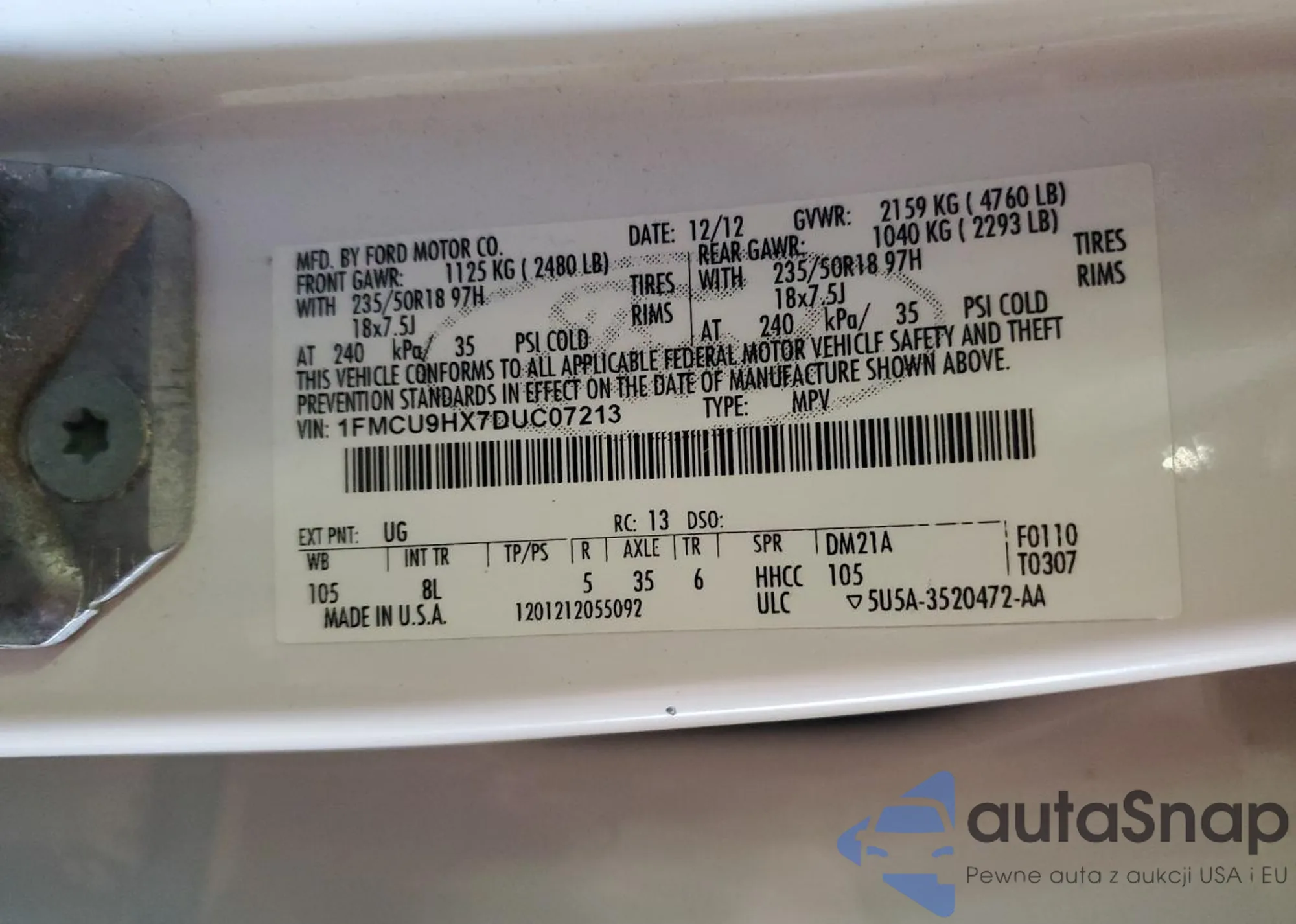 VIN: 1FMCU9HX7DUC07213