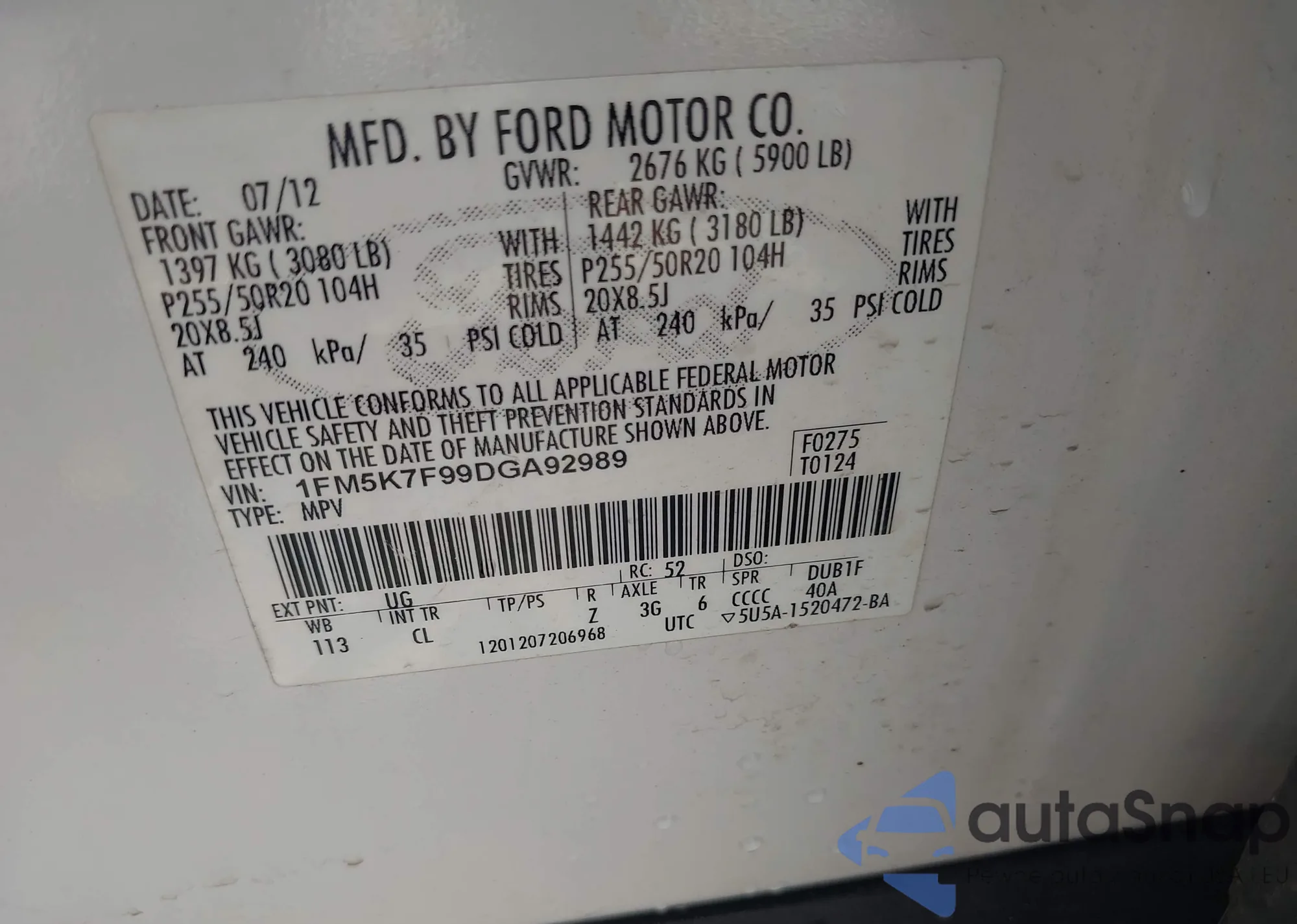 VIN: 1FM5K7F99DGA92989