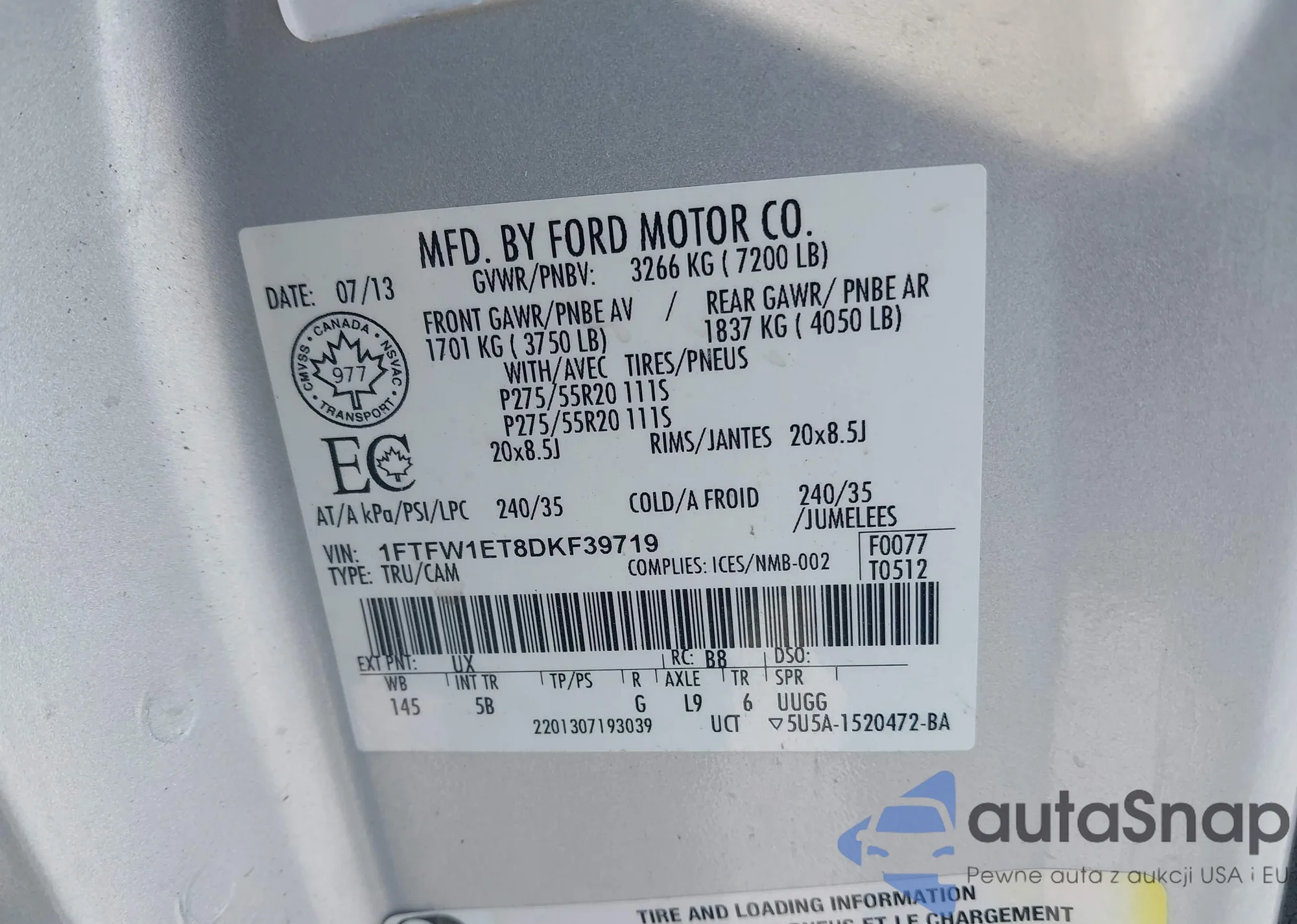Samochód Ford F-150 2013 (VIN 1FTFW1ET8DKF39719) nie był wcześniej licytowany. Dokumenty są czyste, przebieg odpowiada lub jest niższy niż średnia rynku. Sprzedaje go firma ubezpieczeniowa – polecamy zakup. Dostawa do portu zajmie ok. 6–8 tygodni.