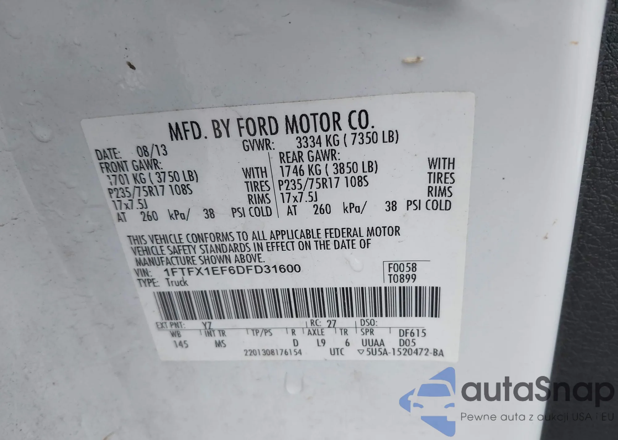 Samochód Ford F-150 2013 (VIN 1FTFX1EF6DFD31600) nie był wcześniej licytowany. Dokumenty są czyste, przebieg odpowiada lub jest niższy niż średnia rynku. Sprzedaje go firma ubezpieczeniowa – polecamy zakup. Dostawa do portu zajmie ok. 6–8 tygodni.