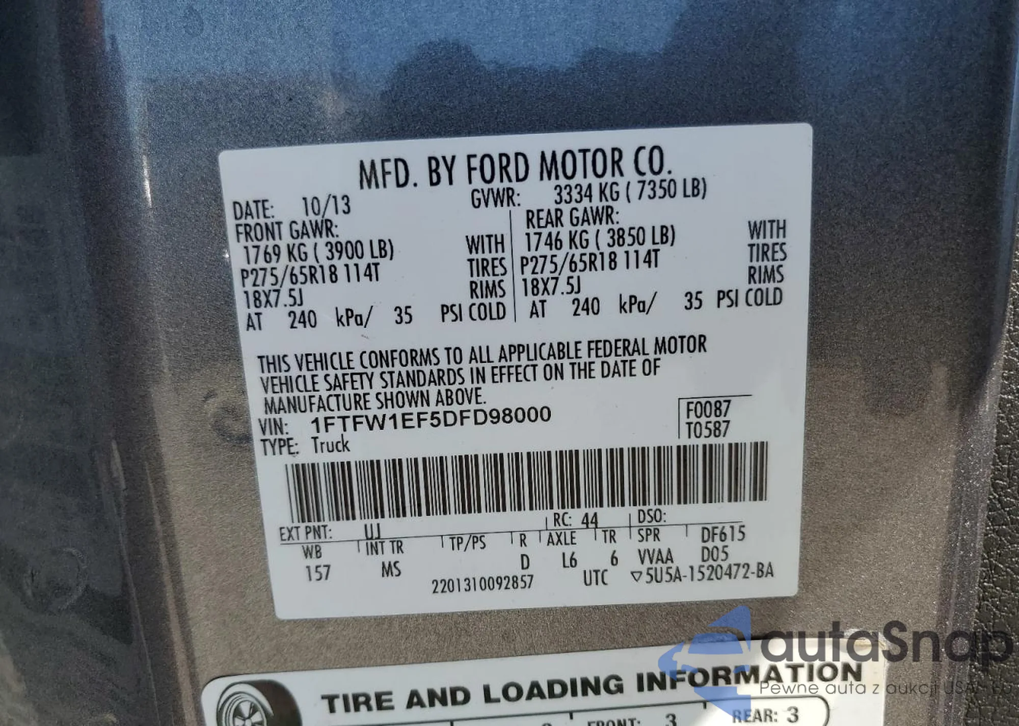 Samochód Ford F-150 2013 (VIN 1FTFW1EF5DFD98000) był już licytowany 1 razy i/lub sprzedaje go niezweryfikowany sprzedawca. Zalecamy raport Carfax i potwierdzenie możliwości rejestracji pojazdu przed zakupem.