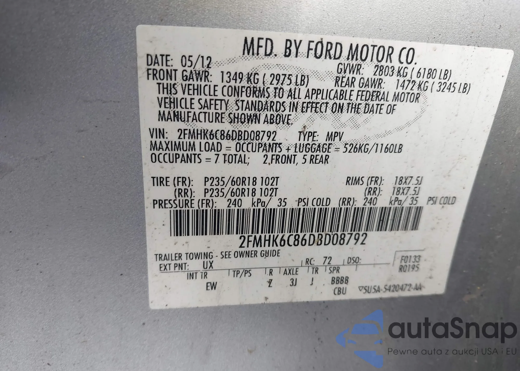 Samochód Ford Flex 2013 (VIN 2FMHK6C86DBD08792) nie był wcześniej licytowany. Dokumenty są czyste, przebieg odpowiada lub jest niższy niż średnia rynku. Sprzedaje go firma ubezpieczeniowa – polecamy zakup. Dostawa do portu zajmie ok. 6–8 tygodni.