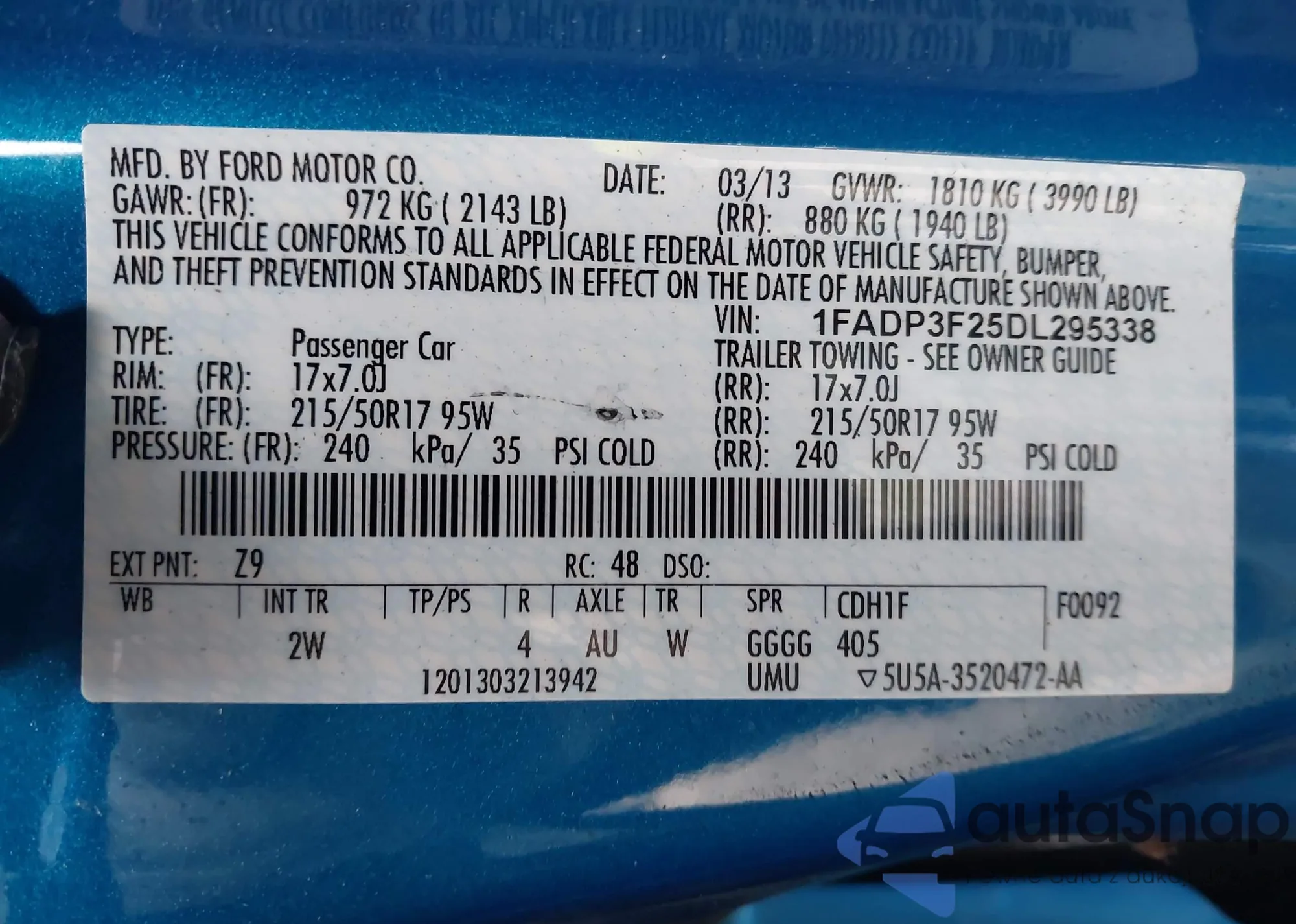 VIN: 1FADP3F25DL295338