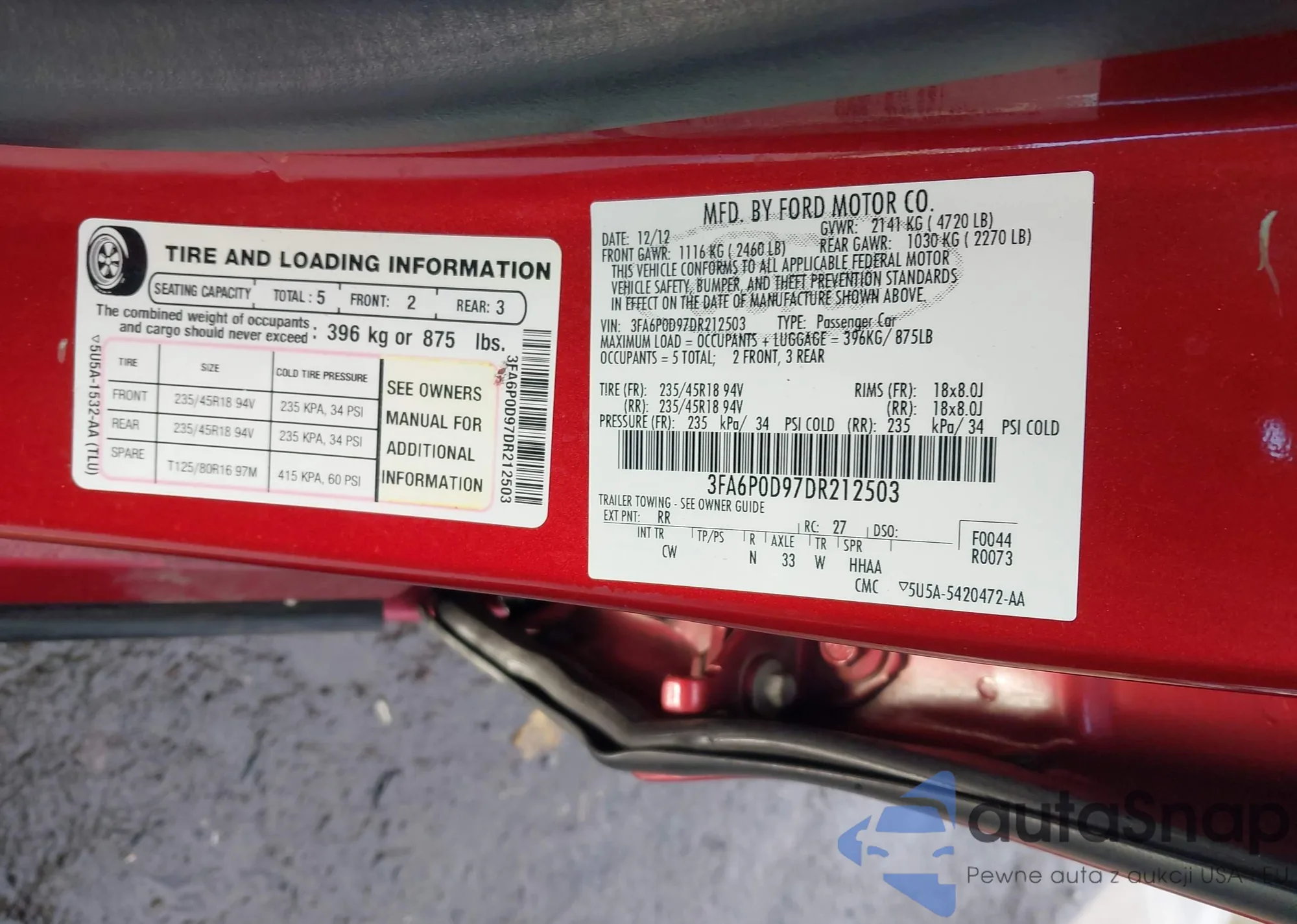 Samochód Ford Fusion 2013 (VIN 3FA6P0D97DR212503) nie był wcześniej licytowany. Dokumenty są czyste, przebieg odpowiada lub jest niższy niż średnia rynku. Sprzedaje go firma ubezpieczeniowa – polecamy zakup. Dostawa do portu zajmie ok. 6–8 tygodni.