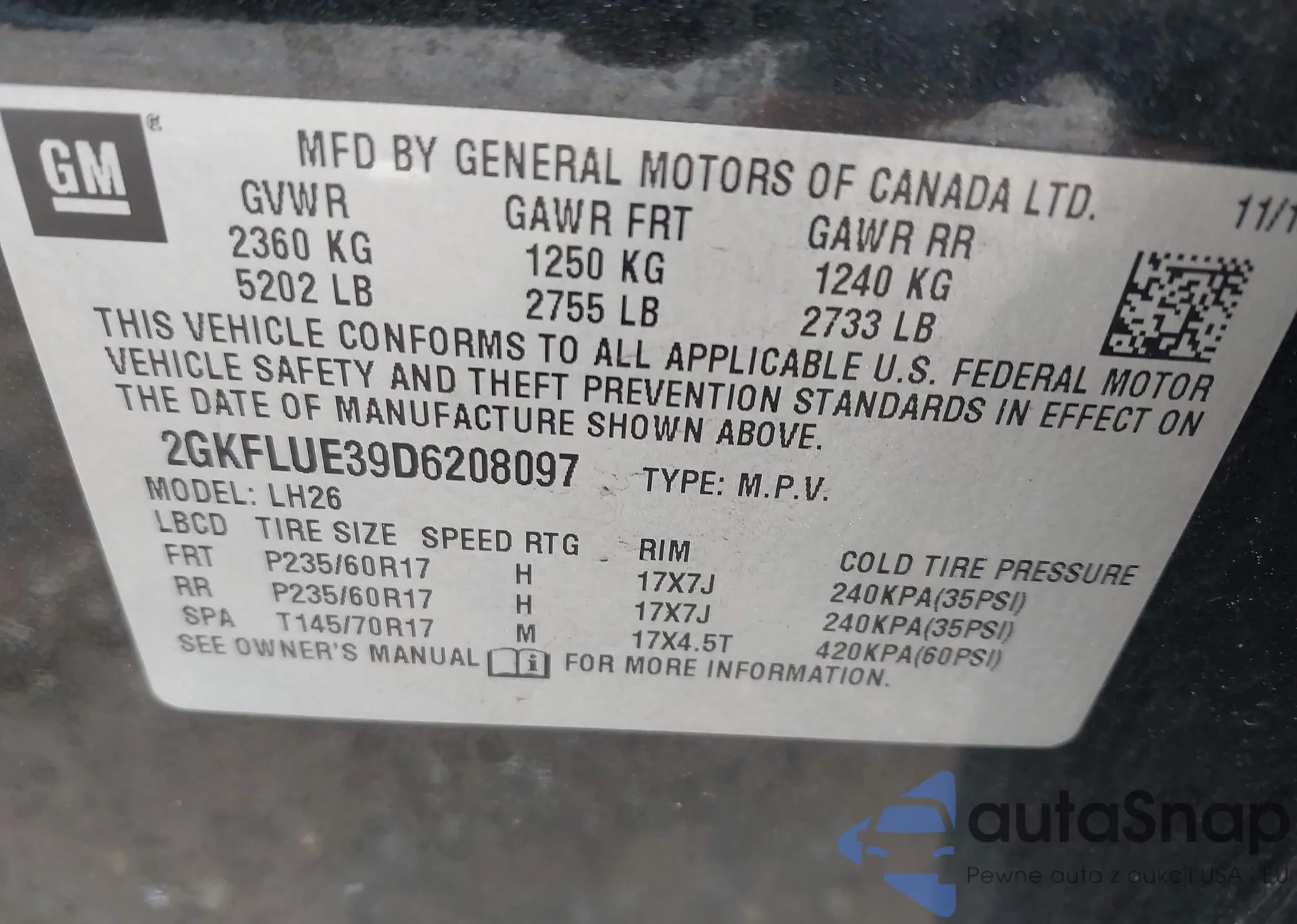 VIN: 2GKFLUE39D6208097