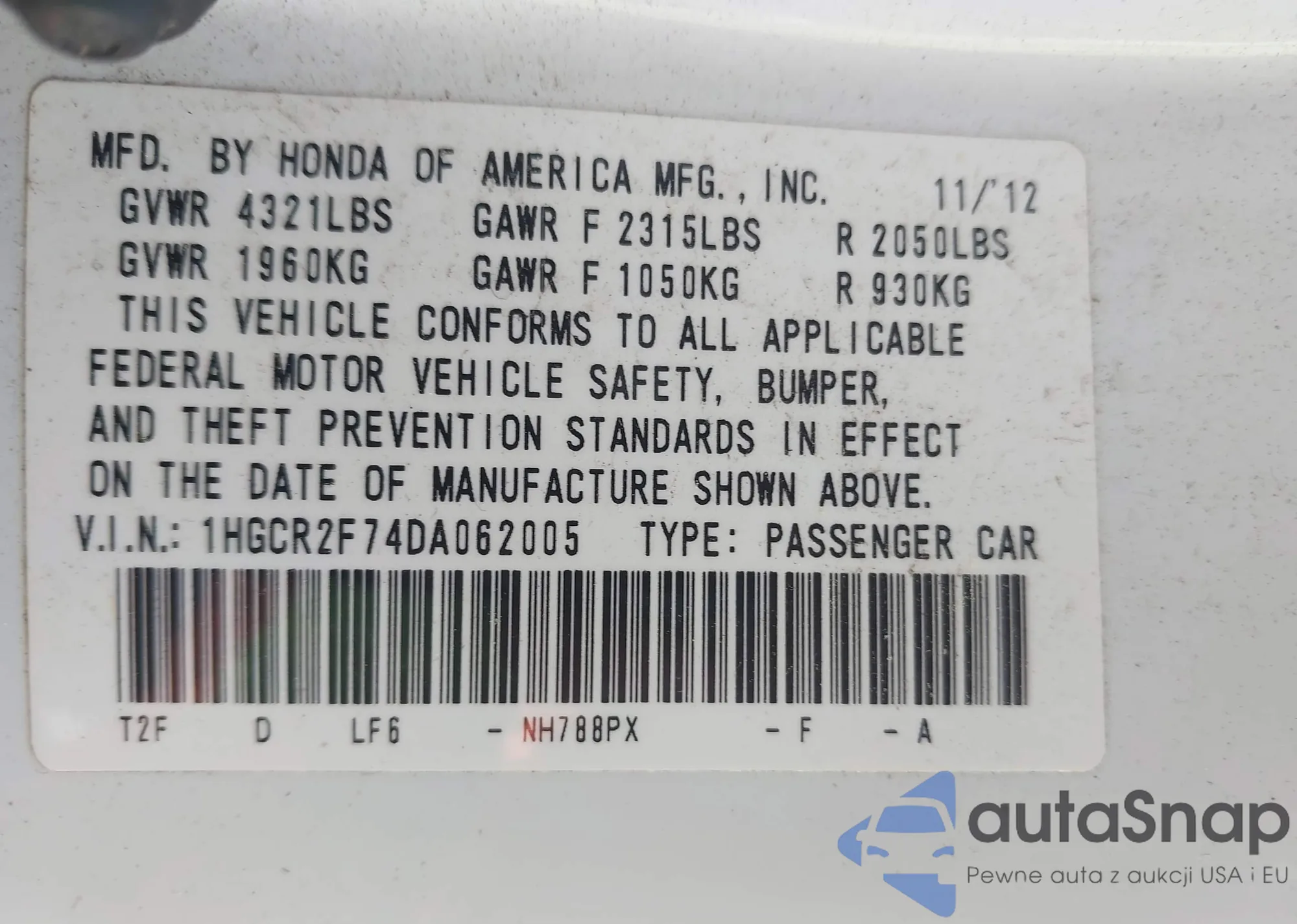 VIN: 1HGCR2F74DA062005