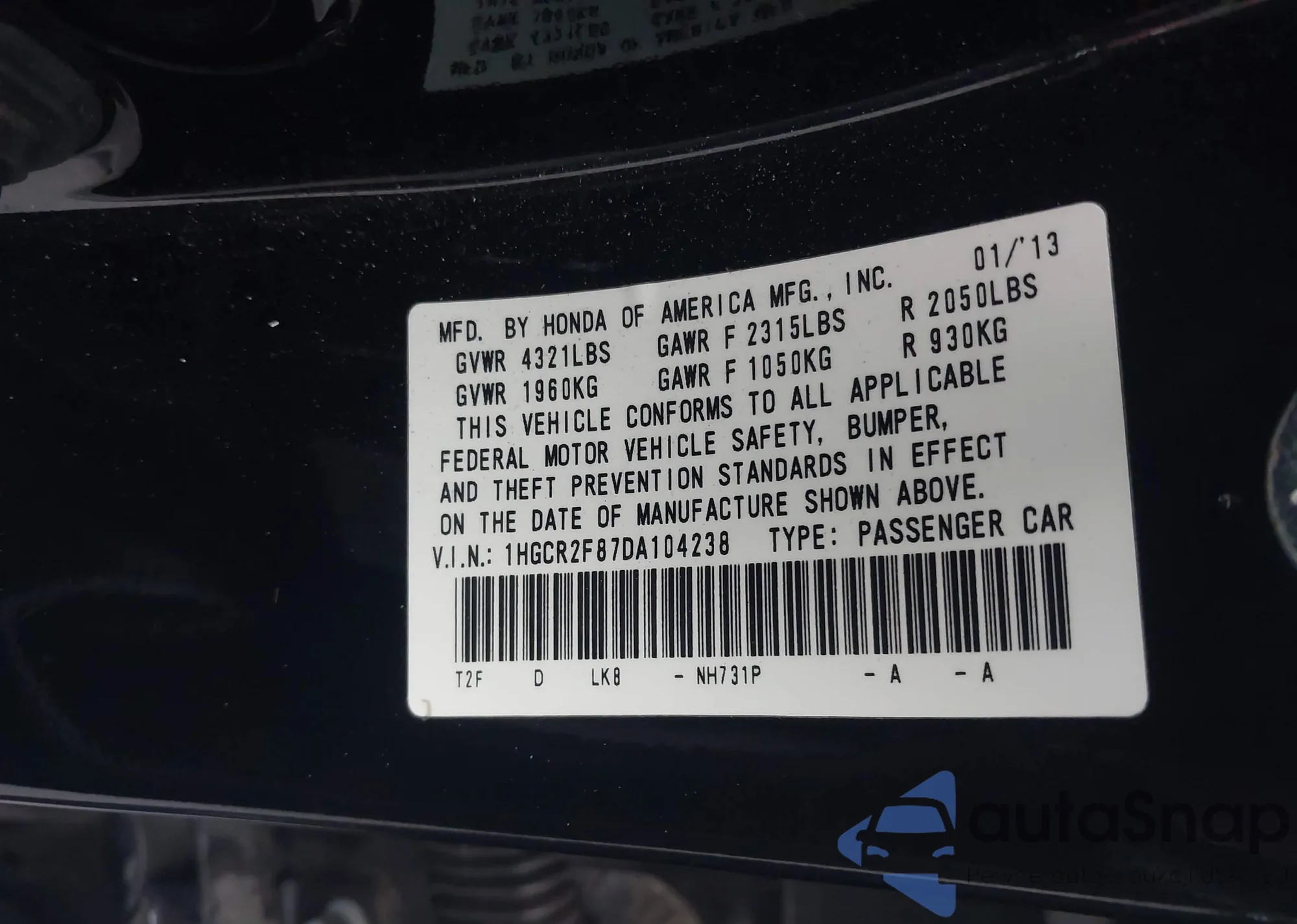 • VIN: 1HGCR2F87DA104238