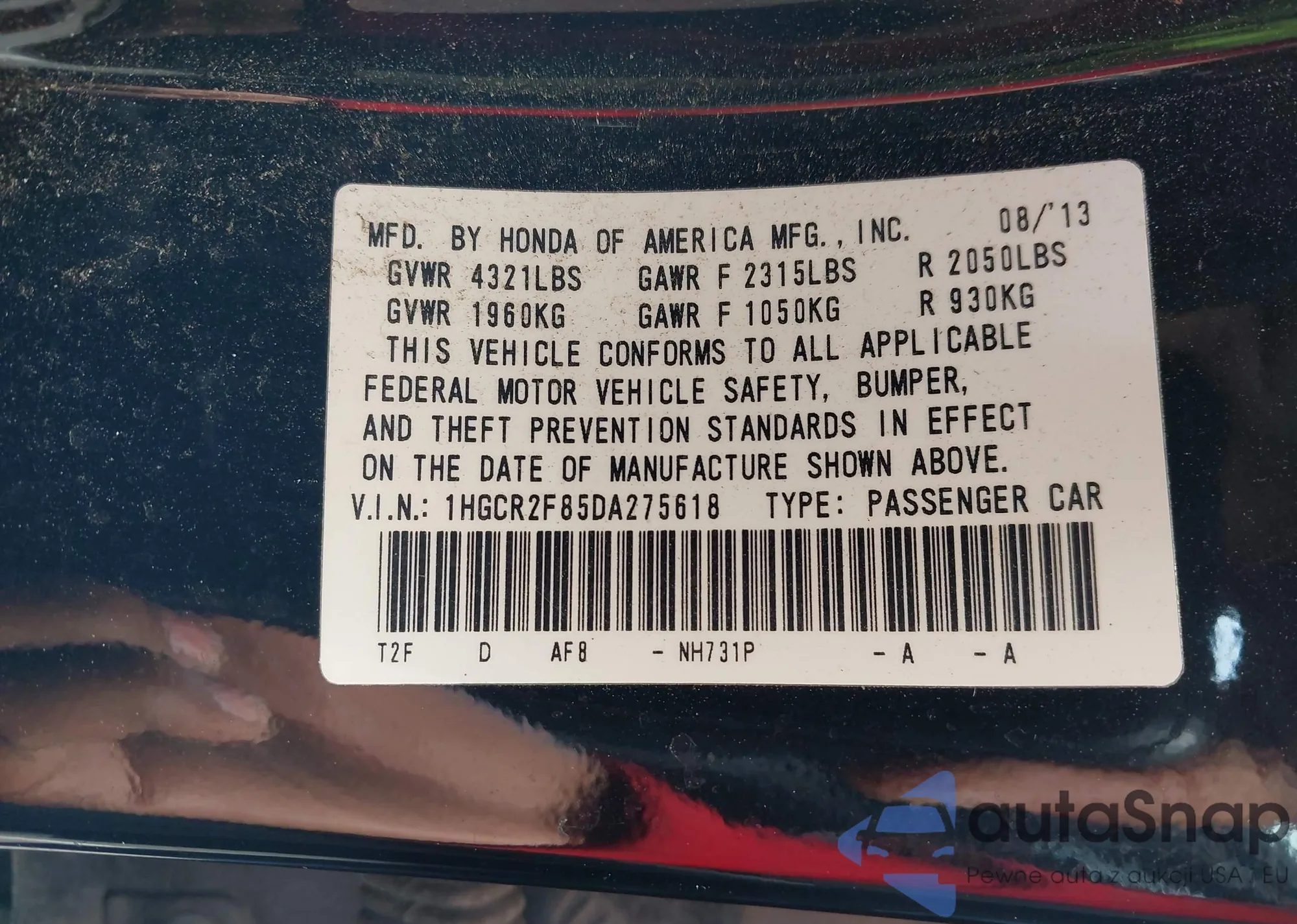 VIN: 1HGCR2F85DA275618