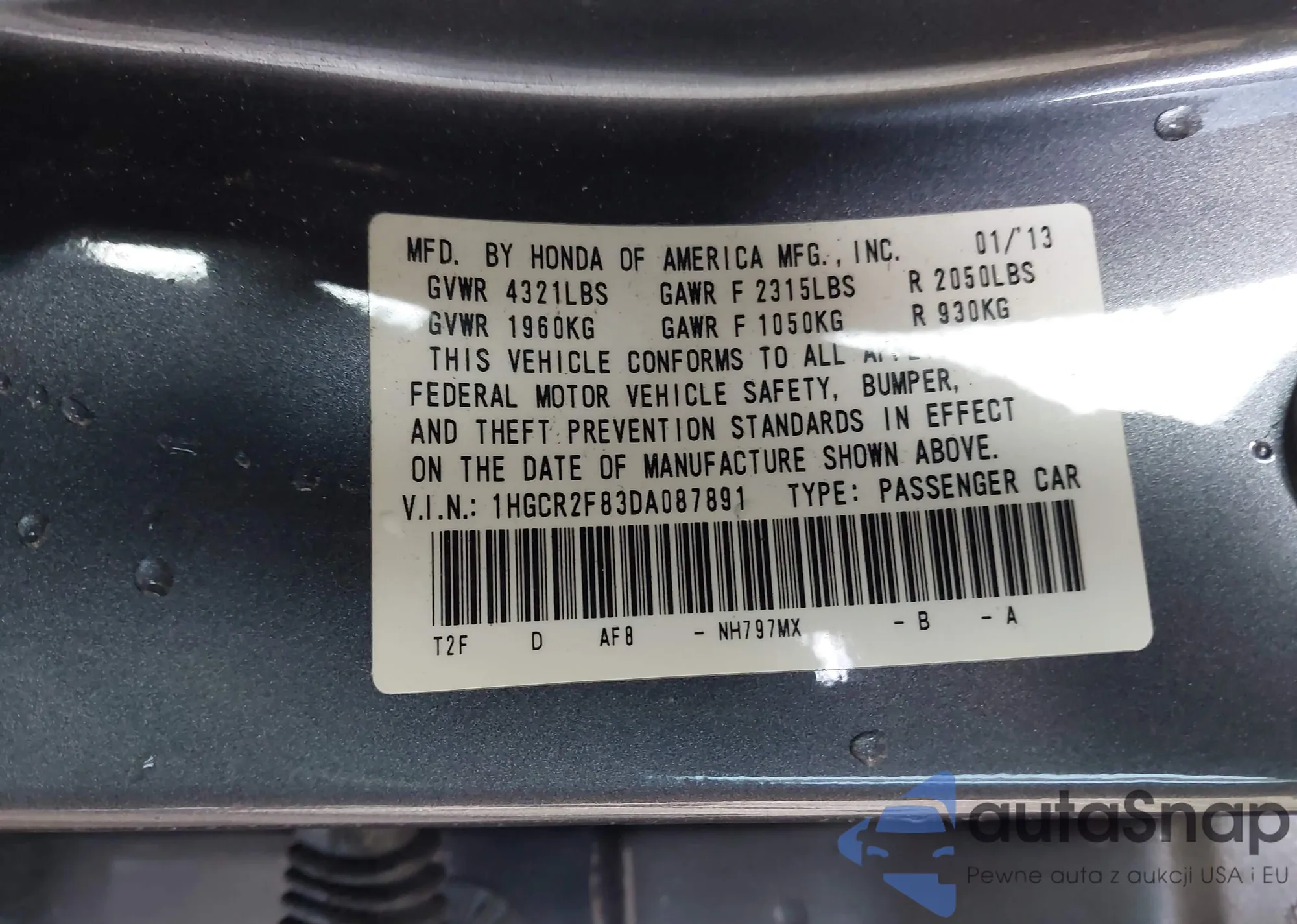 VIN: 1HGCR2F83DA087891