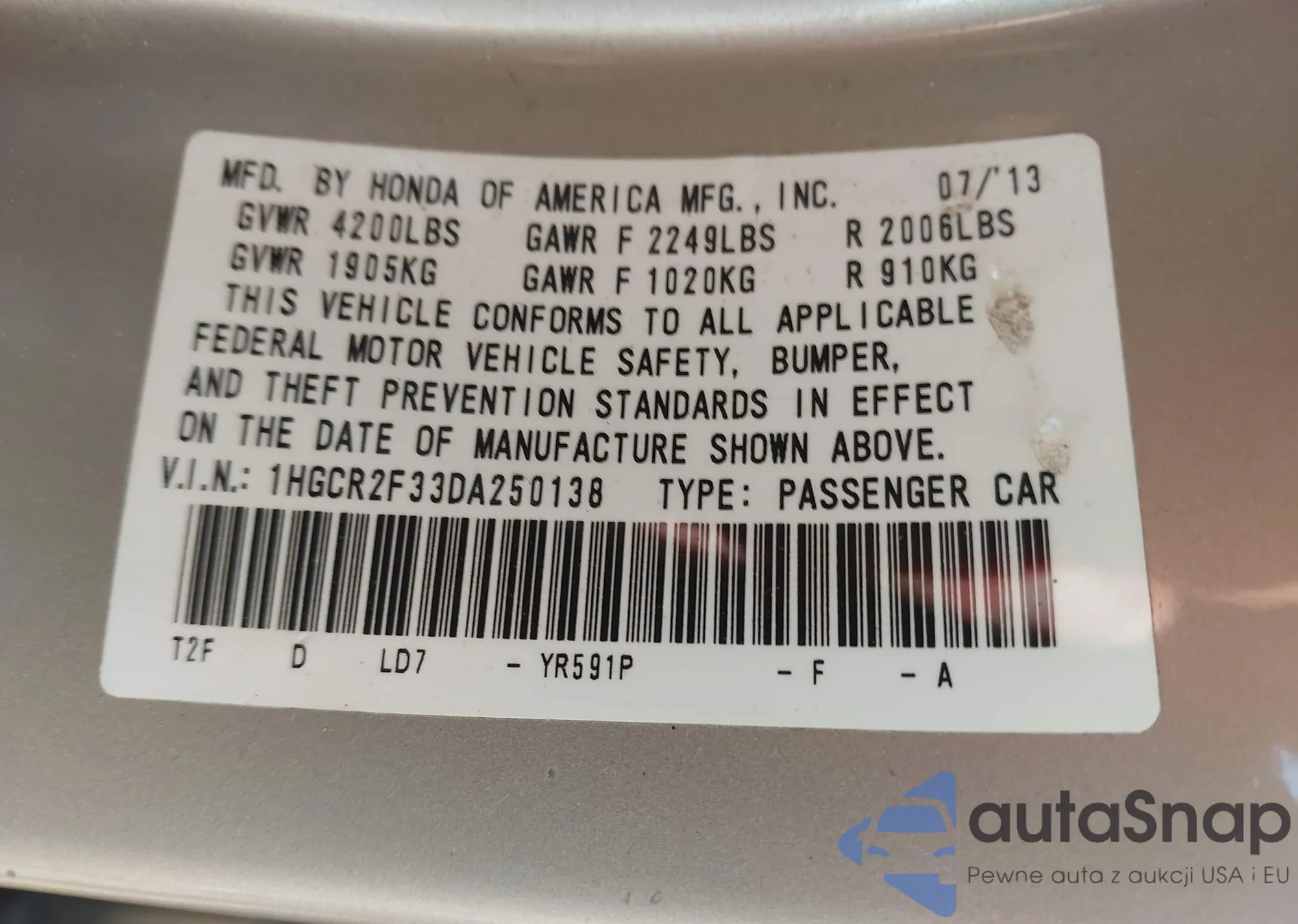 VIN: 1HGCR2F33DA250138