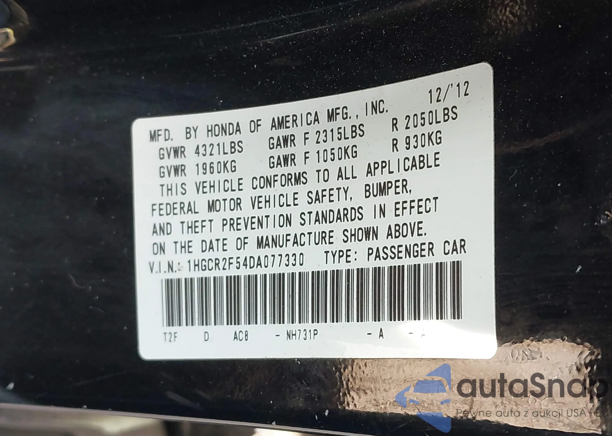 • VIN: 1HGCR2F54DA077330