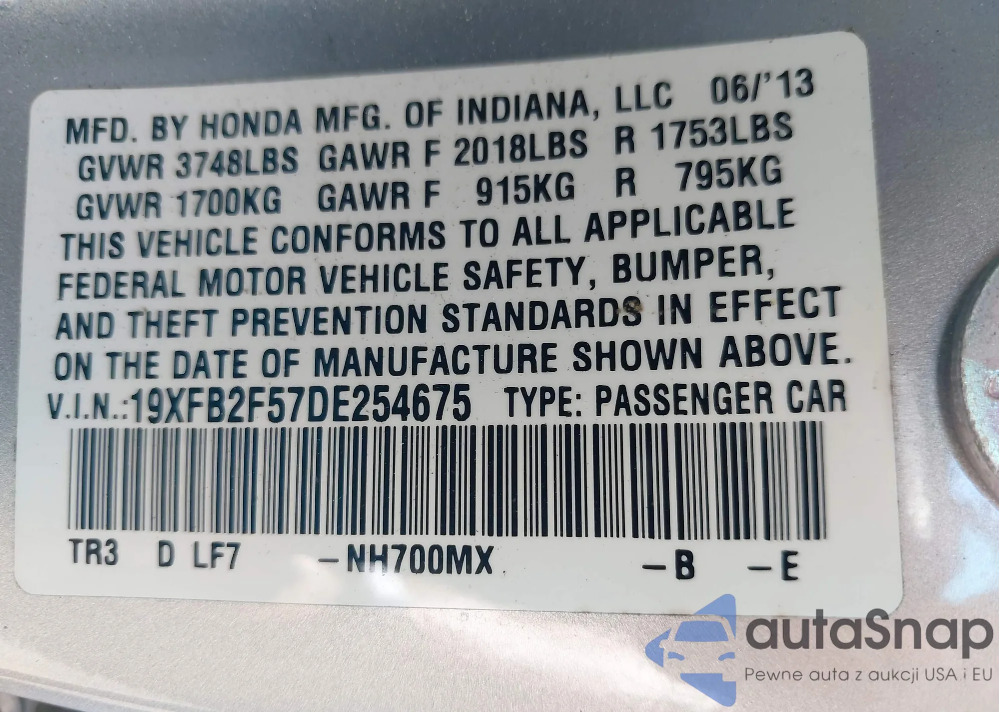 VIN: 19XFB2F57DE254675