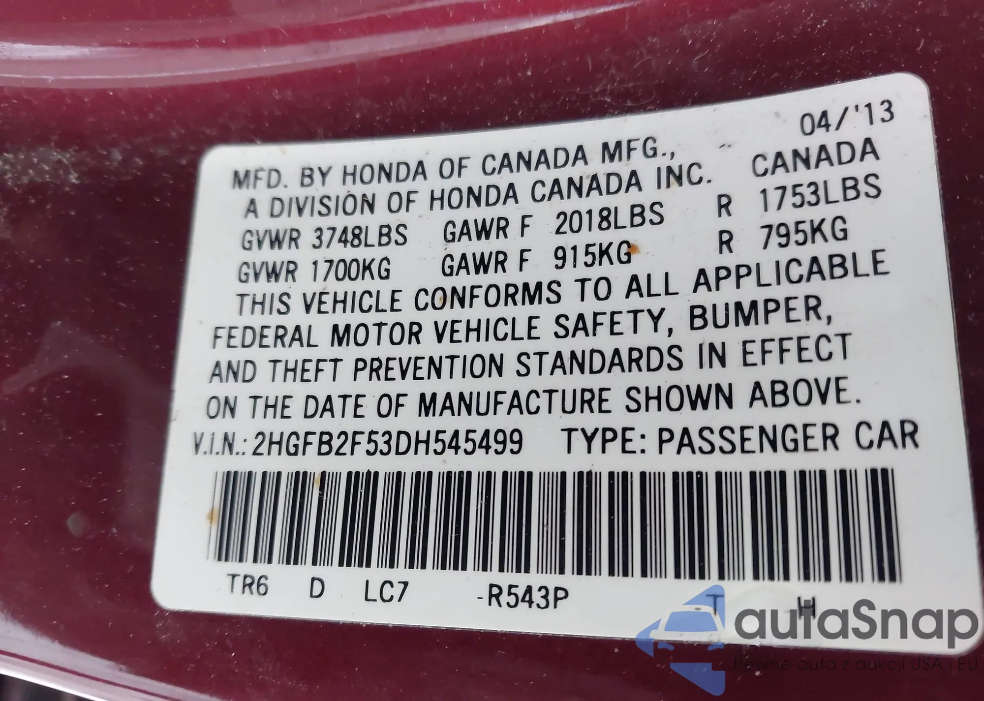 VIN: 2HGFB2F53DH545499