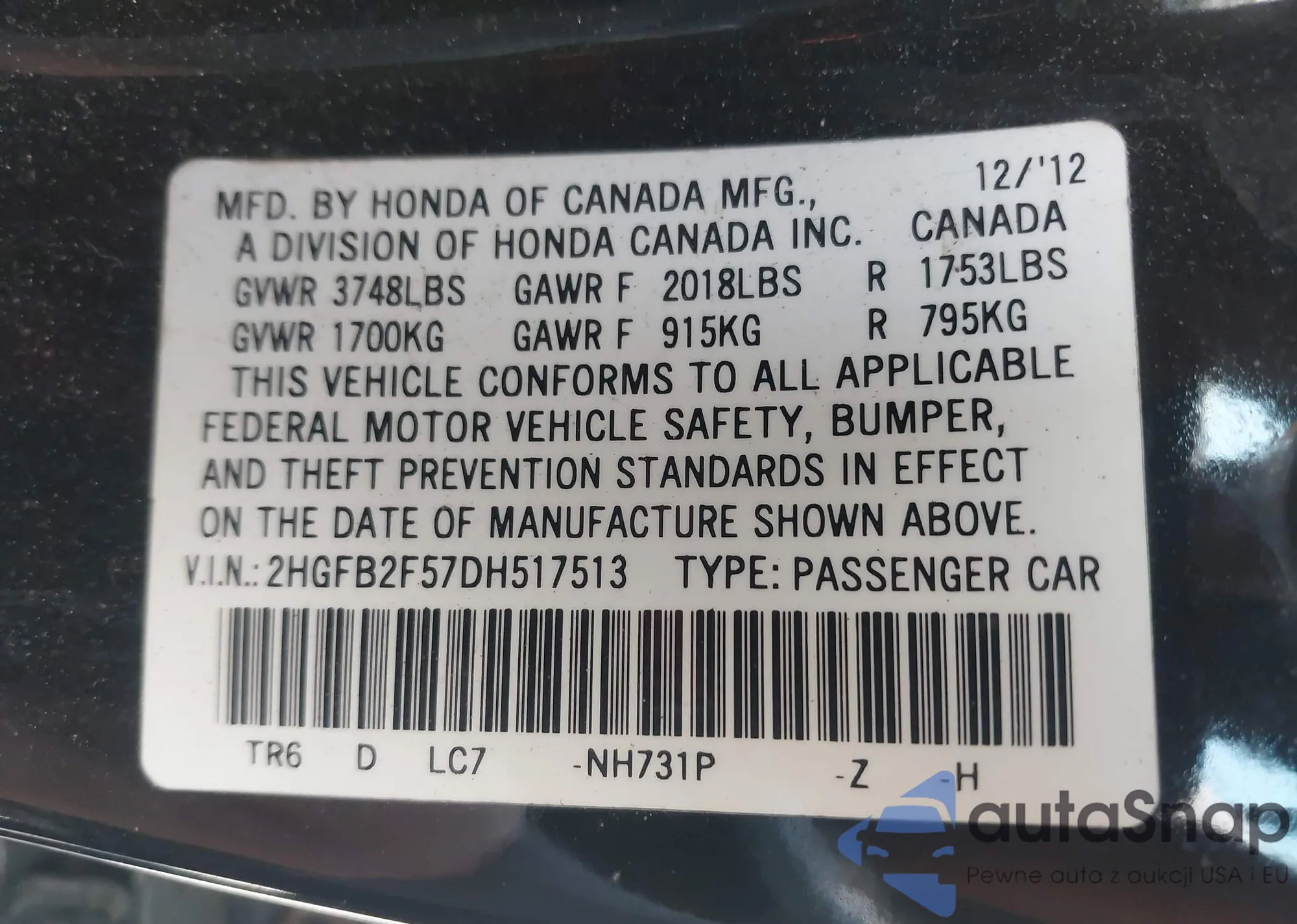 VIN: 2HGFB2F57DH517513