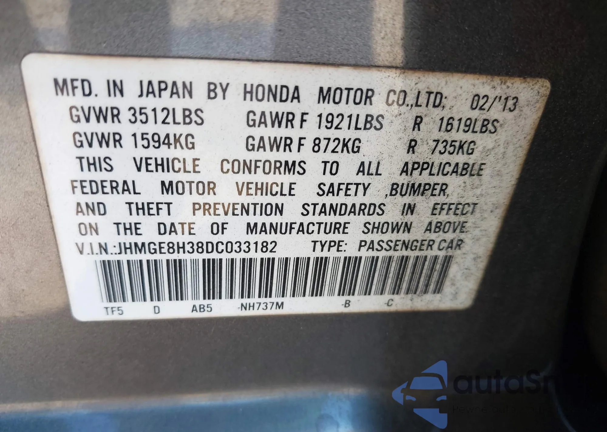 VIN: JHMGE8H38DC033182
