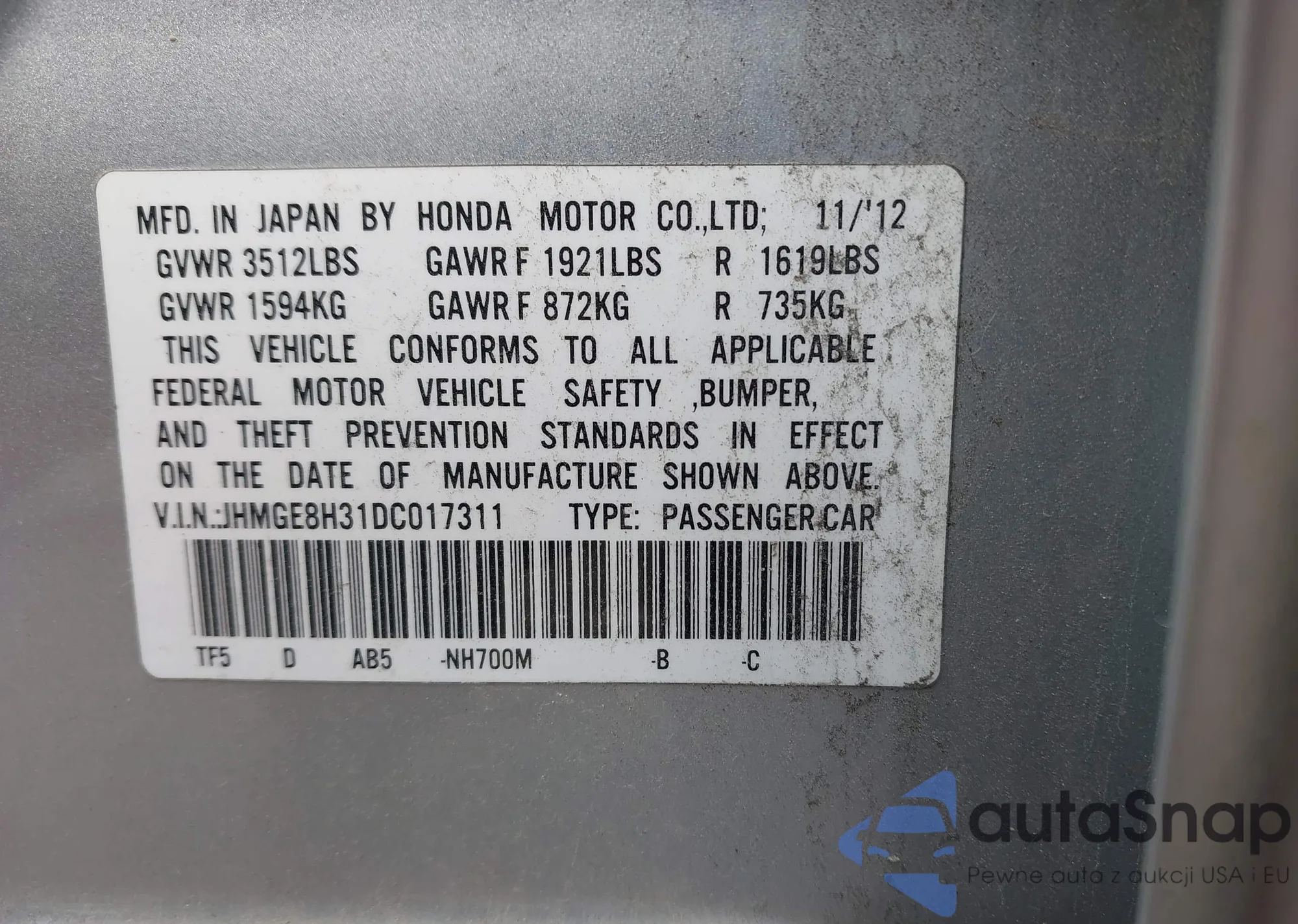 Samochód Honda Fit 2013 (VIN JHMGE8H31DC017311) był już licytowany 1 razy i/lub sprzedaje go niezweryfikowany sprzedawca. Zalecamy raport Carfax i potwierdzenie możliwości rejestracji pojazdu przed zakupem.