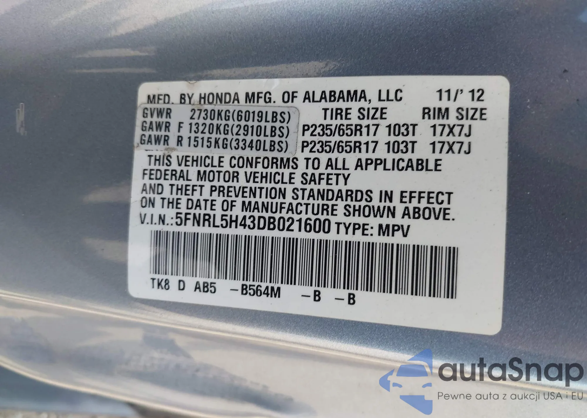 VIN: 5FNRL5H43DB021600