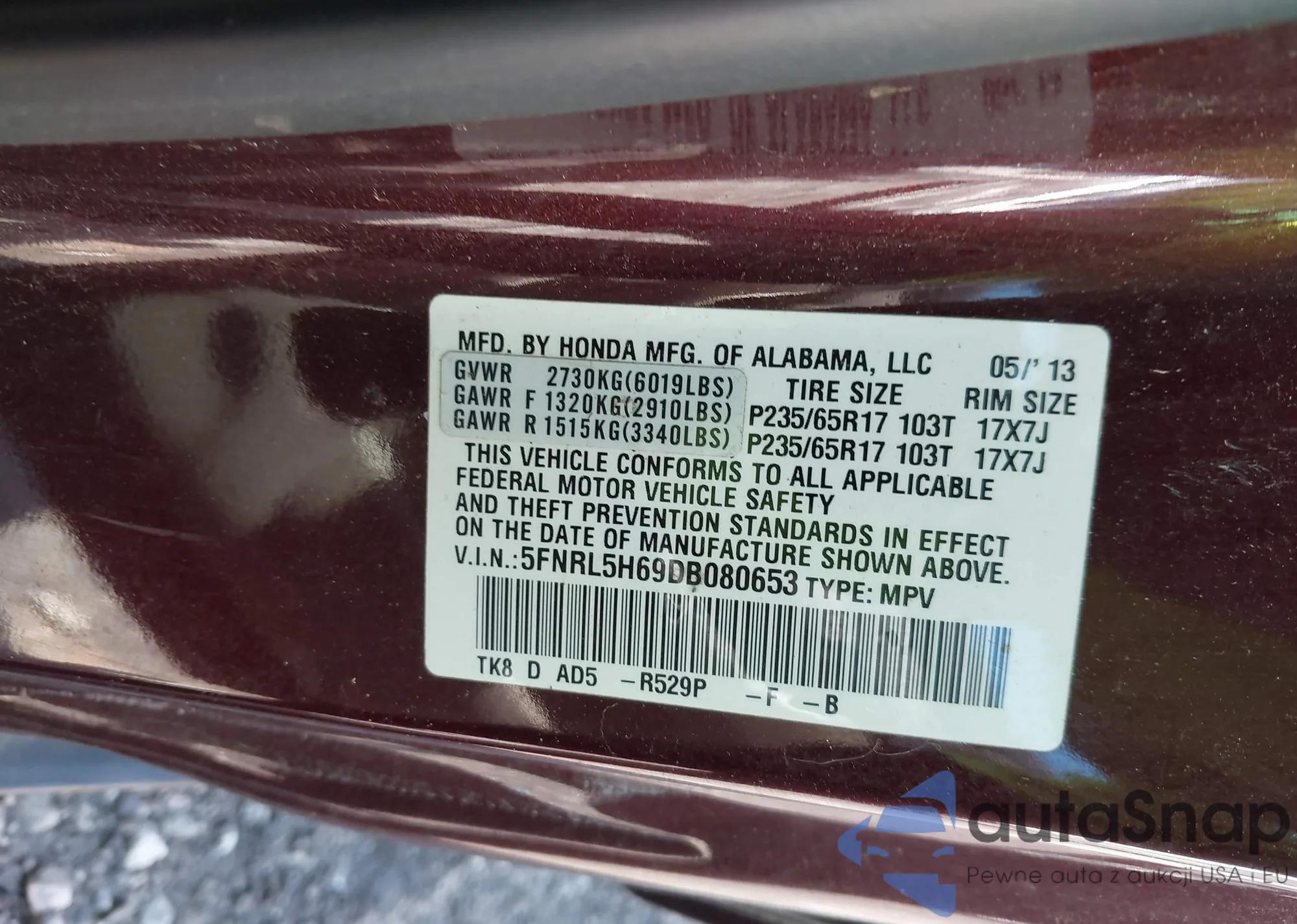 VIN: 5FNRL5H69DB080653