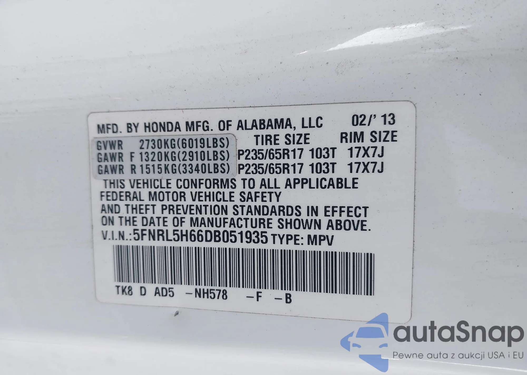 • VIN: 5FNRL5H66DB051935