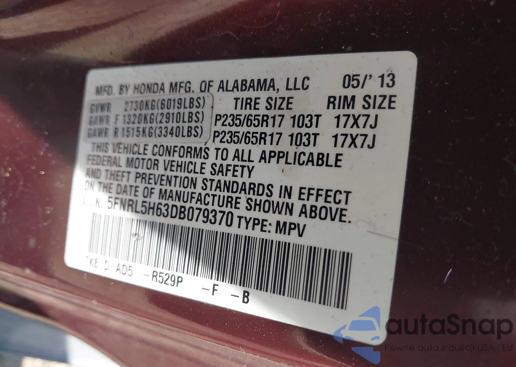 VIN: 5FNRL5H63DB079370