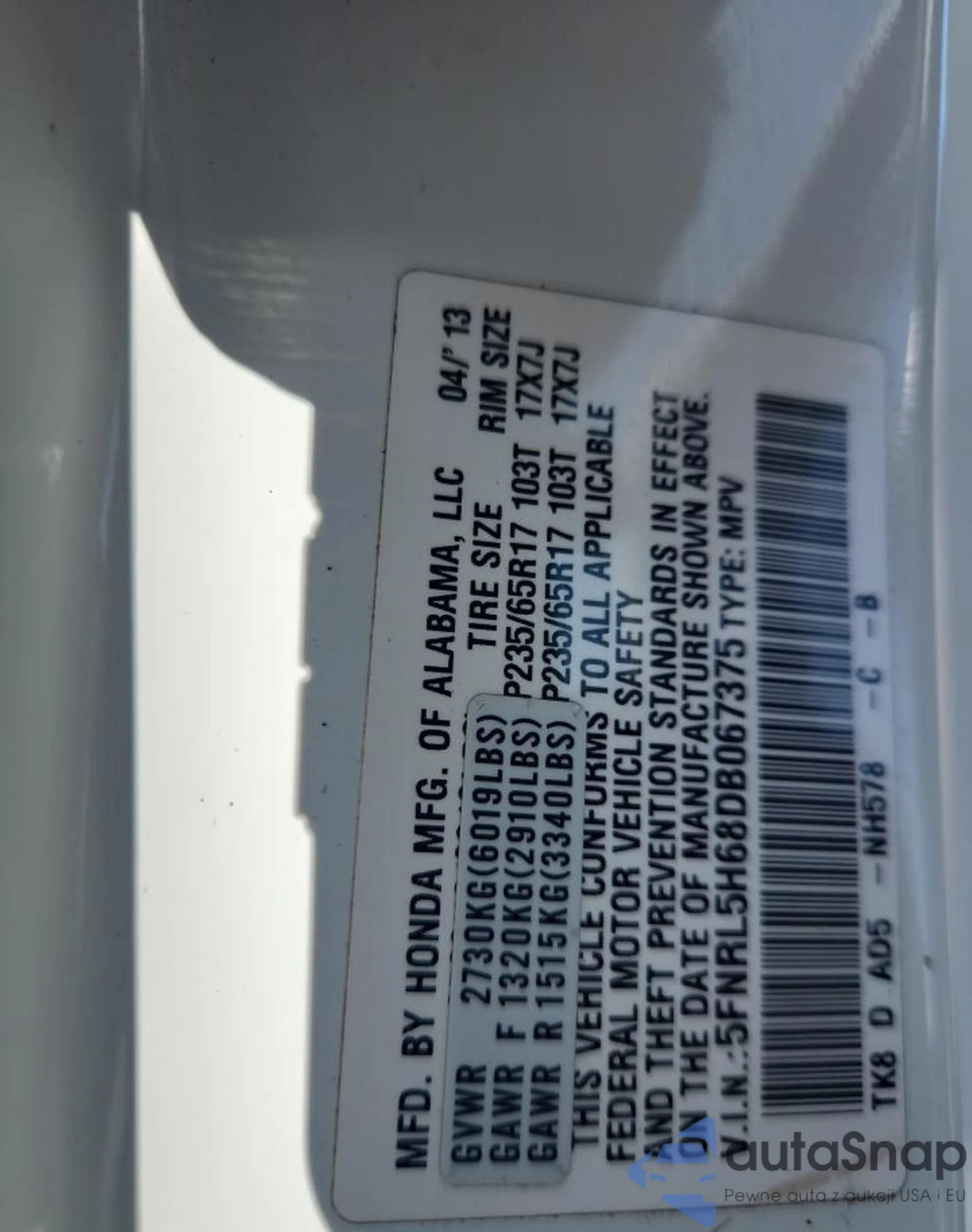 VIN: 5FNRL5H68DB067375