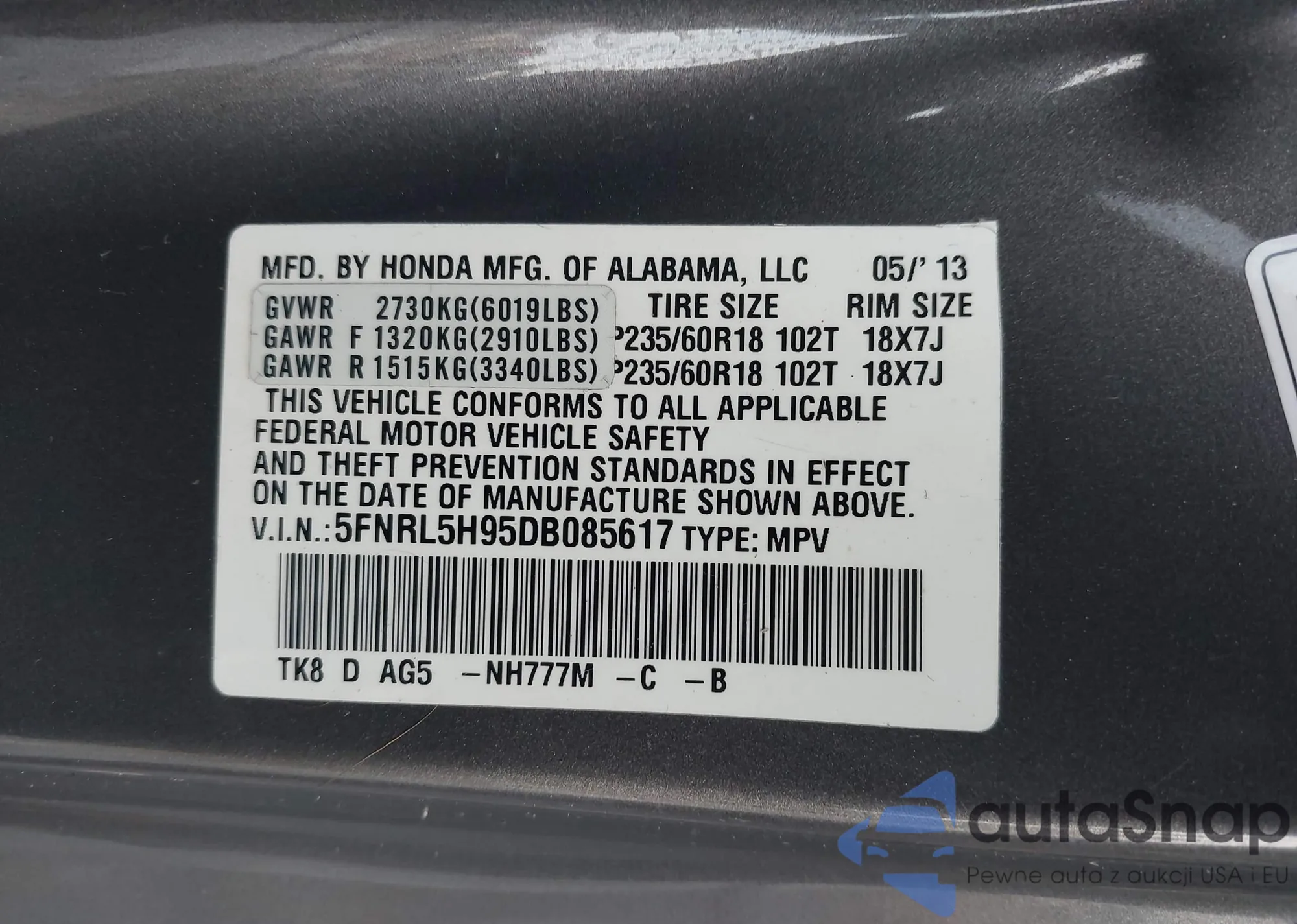 VIN: 5FNRL5H95DB085617