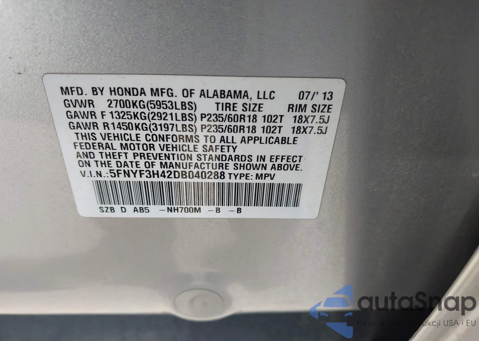 VIN: 5FNYF3H42DB040288