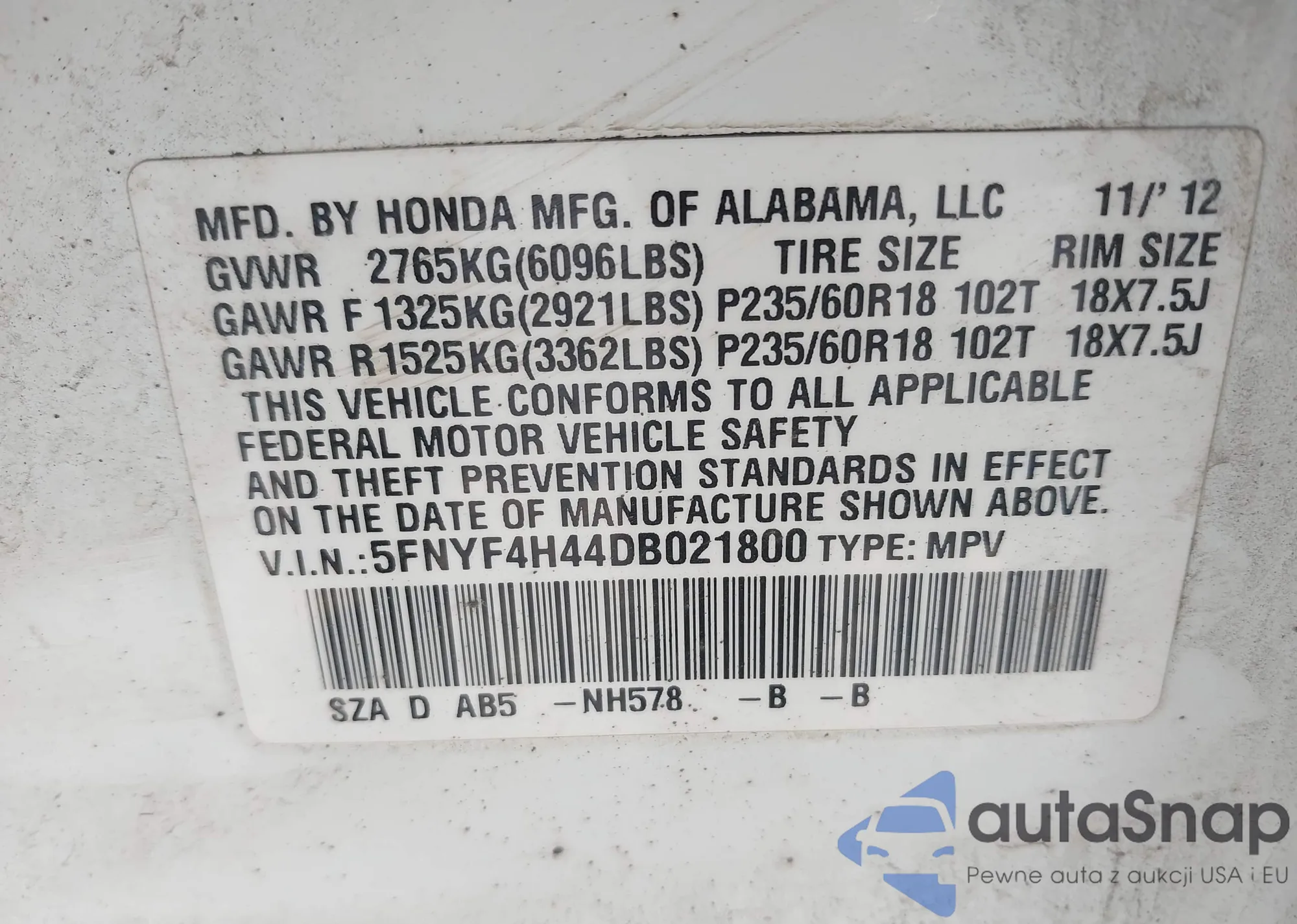 Samochód Honda Pilot 2013 (VIN 5FNYF4H44DB021800) nie był wcześniej licytowany. Dokumenty są czyste, przebieg odpowiada lub jest niższy niż średnia rynku. Sprzedaje go firma ubezpieczeniowa – polecamy zakup. Dostawa do portu zajmie ok. 6–8 tygodni.