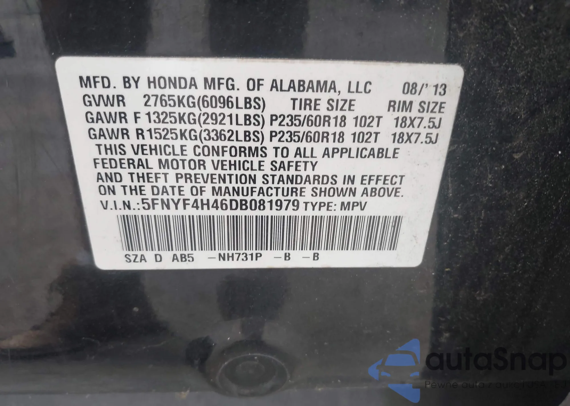 VIN: 5FNYF4H46DB081979