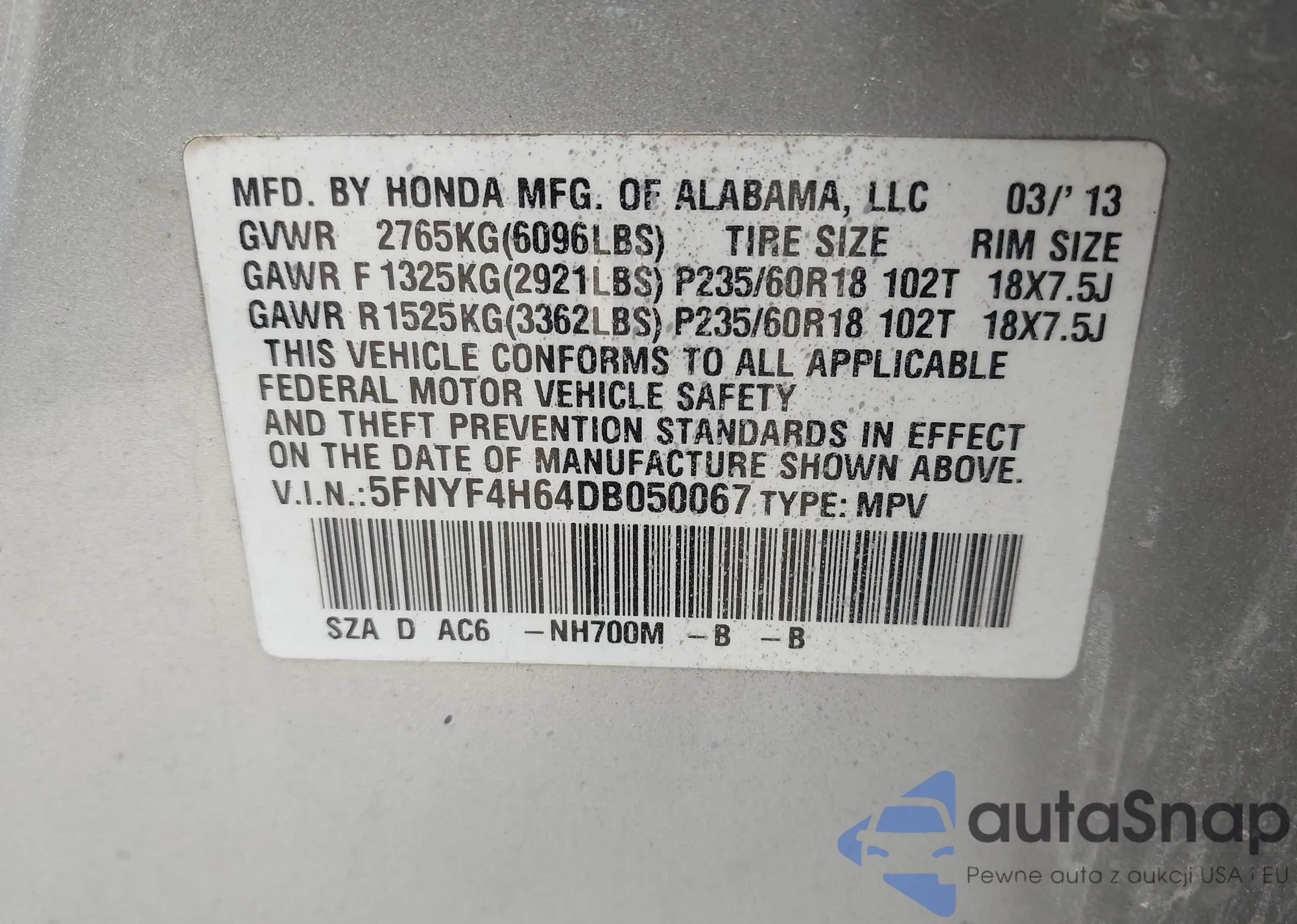 VIN: 5FNYF4H64DB050067