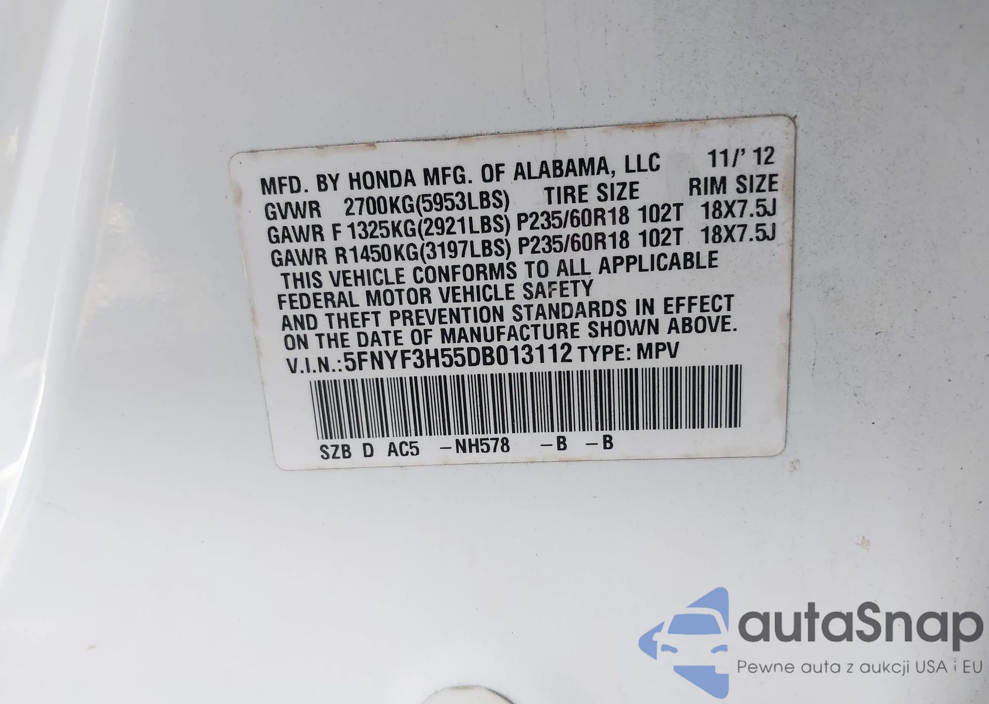 • VIN: 5FNYF3H55DB013112