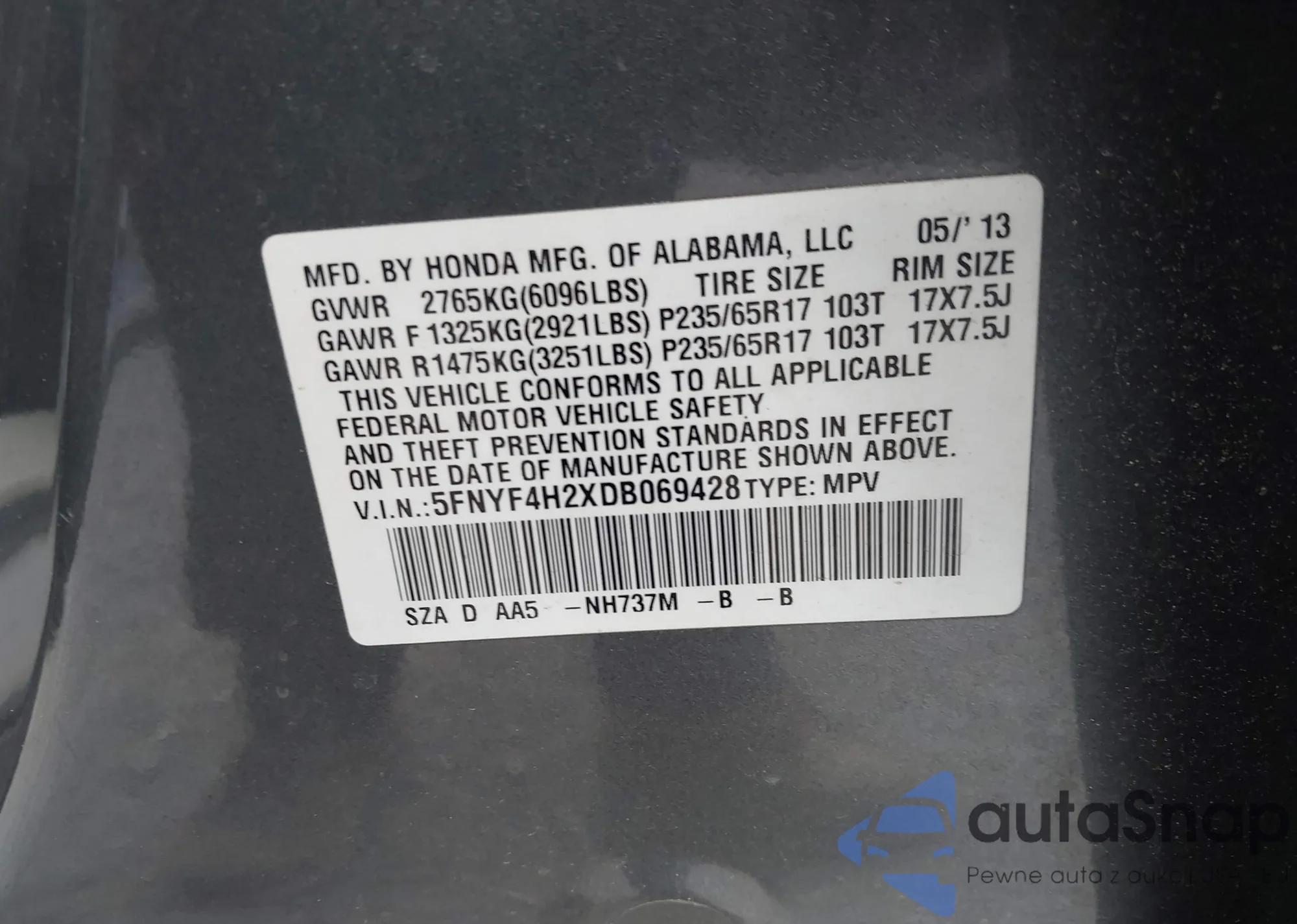 VIN: 5FNYF4H2XDB069428
