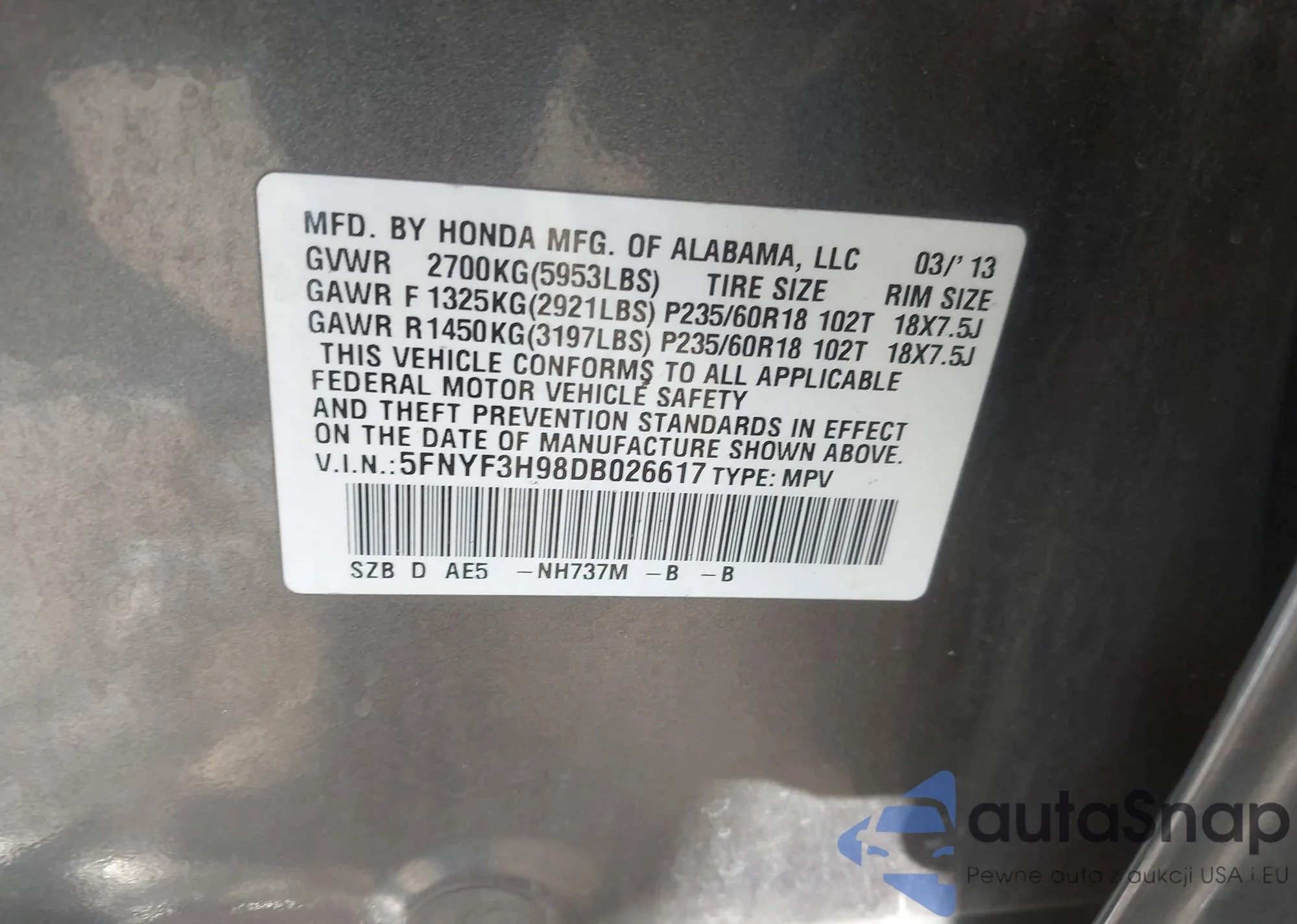 VIN: 5FNYF3H98DB026617