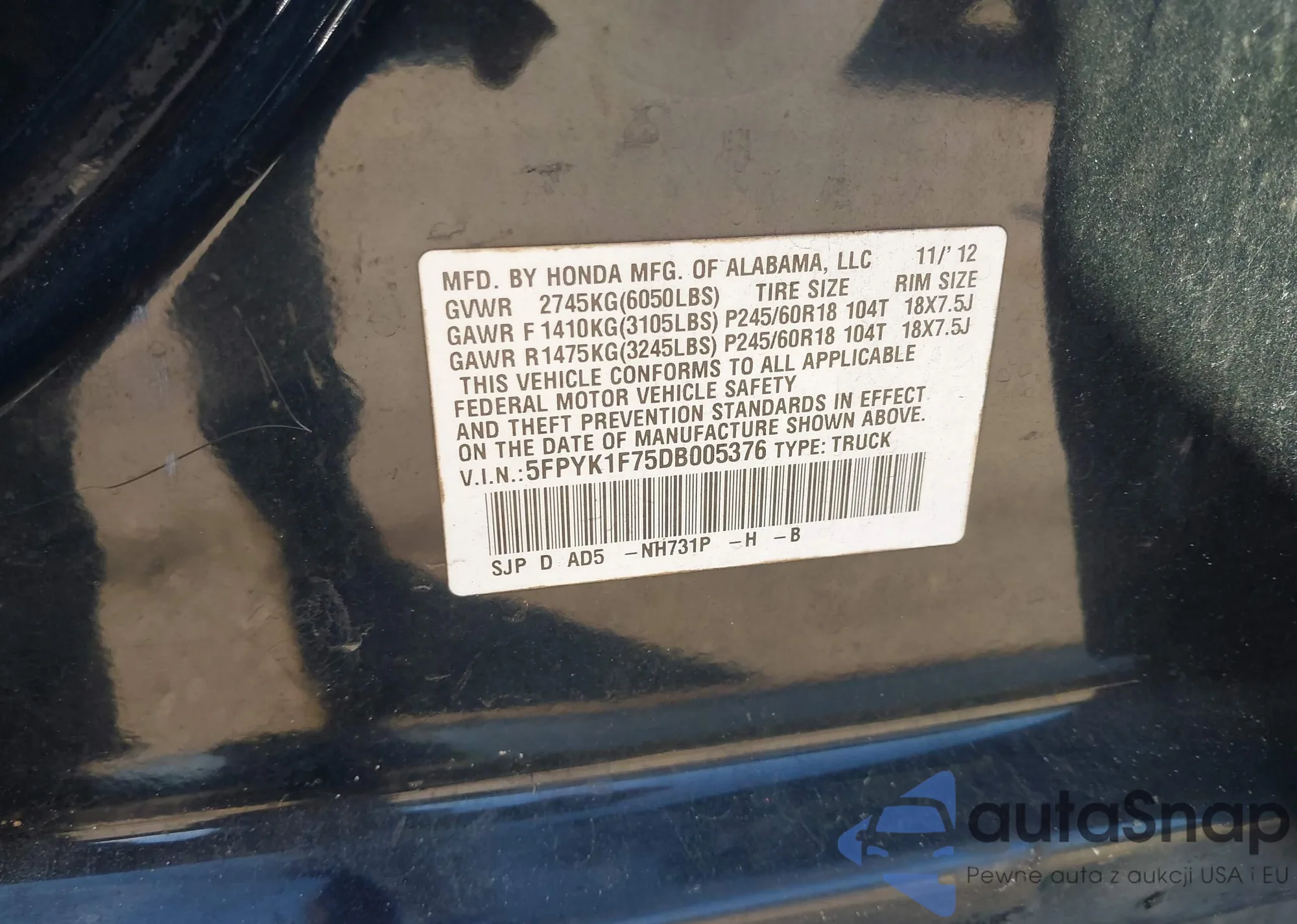 • VIN: 5FPYK1F75DB005376