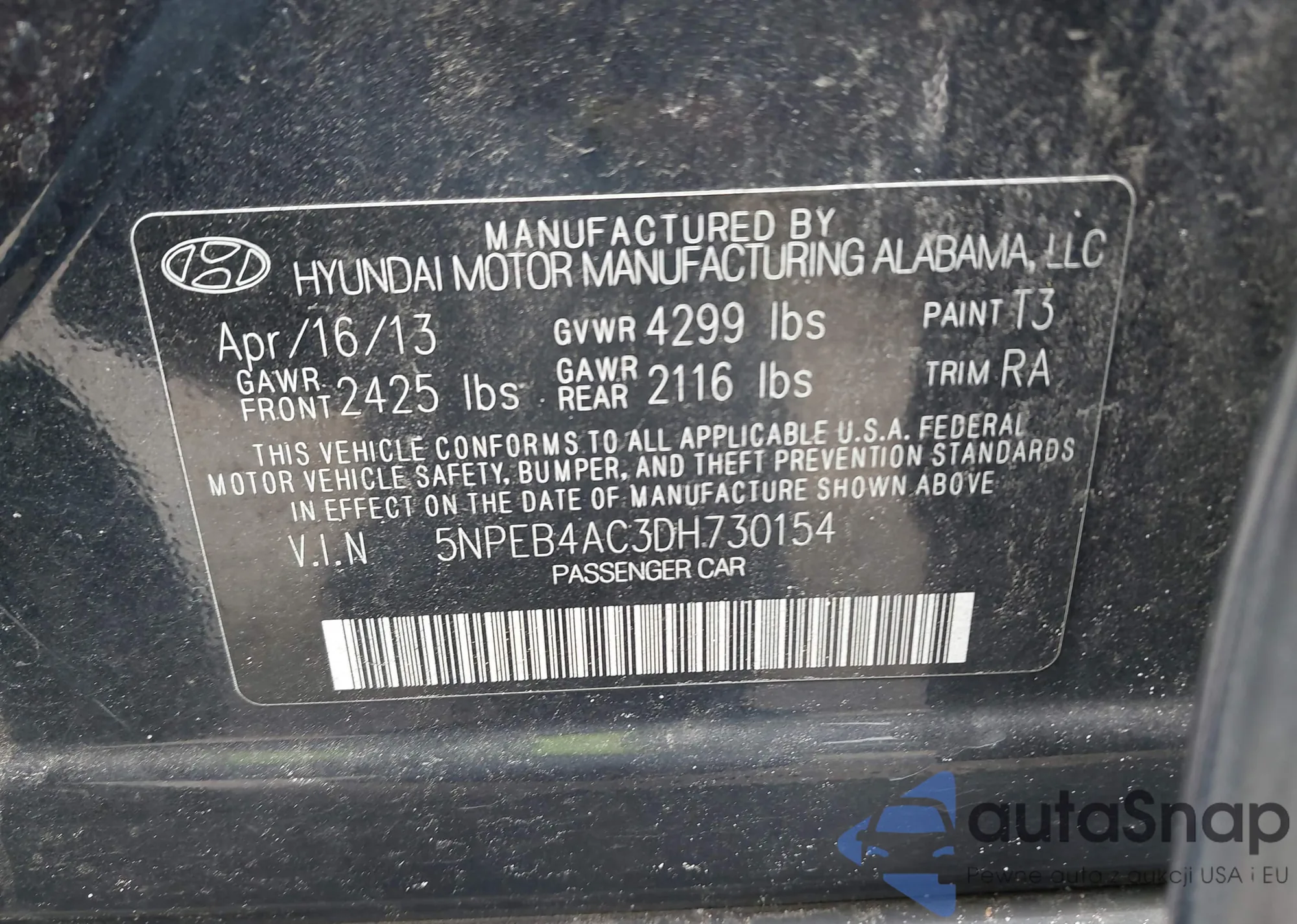 VIN: 5NPEB4AC3DH730154