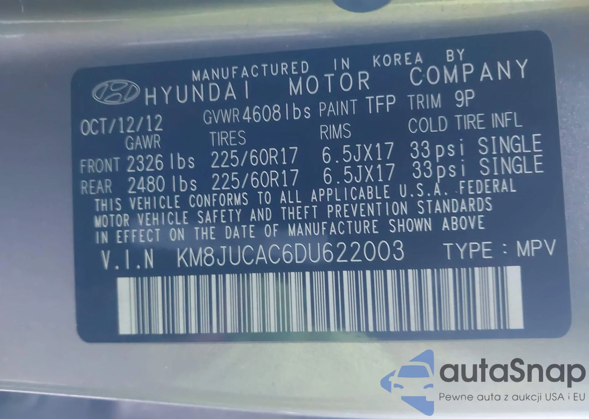 • VIN: KM8JUCAC6DU622003