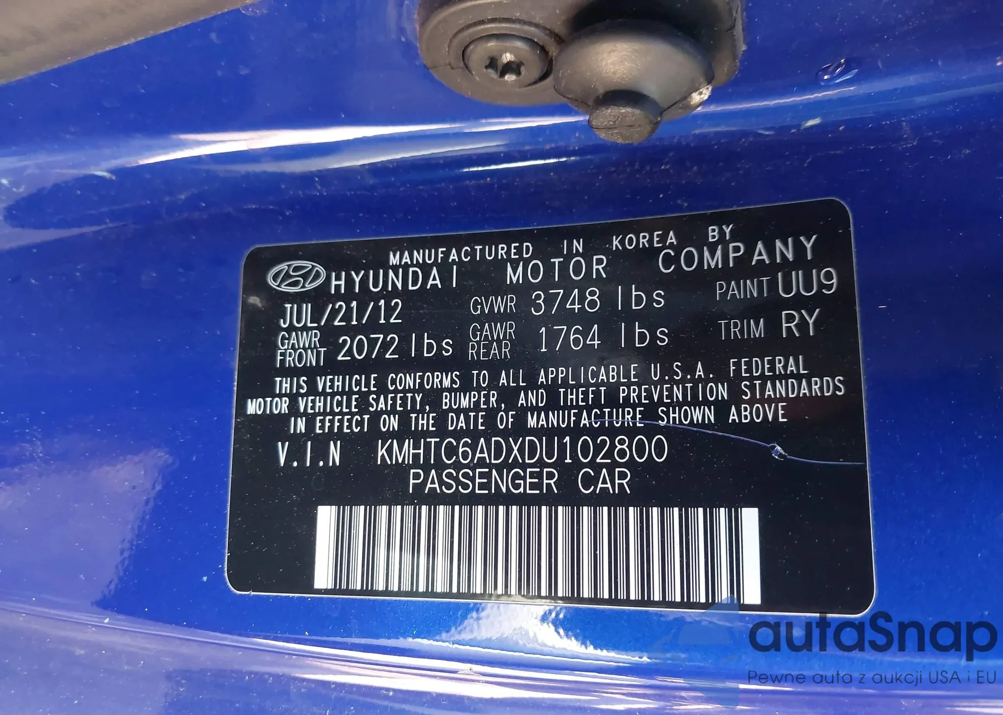 Samochód Hyundai Veloster 2013 (VIN KMHTC6ADXDU102800) nie był wcześniej licytowany. Dokumenty są czyste, przebieg odpowiada lub jest niższy niż średnia rynku. Sprzedaje go firma ubezpieczeniowa – polecamy zakup. Dostawa do portu zajmie ok. 6–8 tygodni.