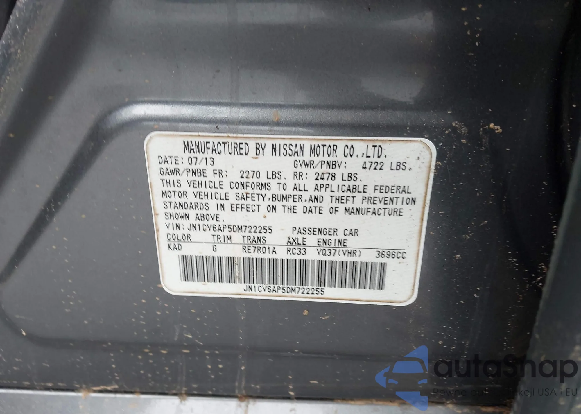 Samochód Infiniti G 2013 (VIN JN1CV6AP5DM722255) nie był wcześniej licytowany. Dokumenty są czyste, przebieg odpowiada lub jest niższy niż średnia rynku. Sprzedaje go firma ubezpieczeniowa – polecamy zakup. Dostawa do portu zajmie ok. 6–8 tygodni.