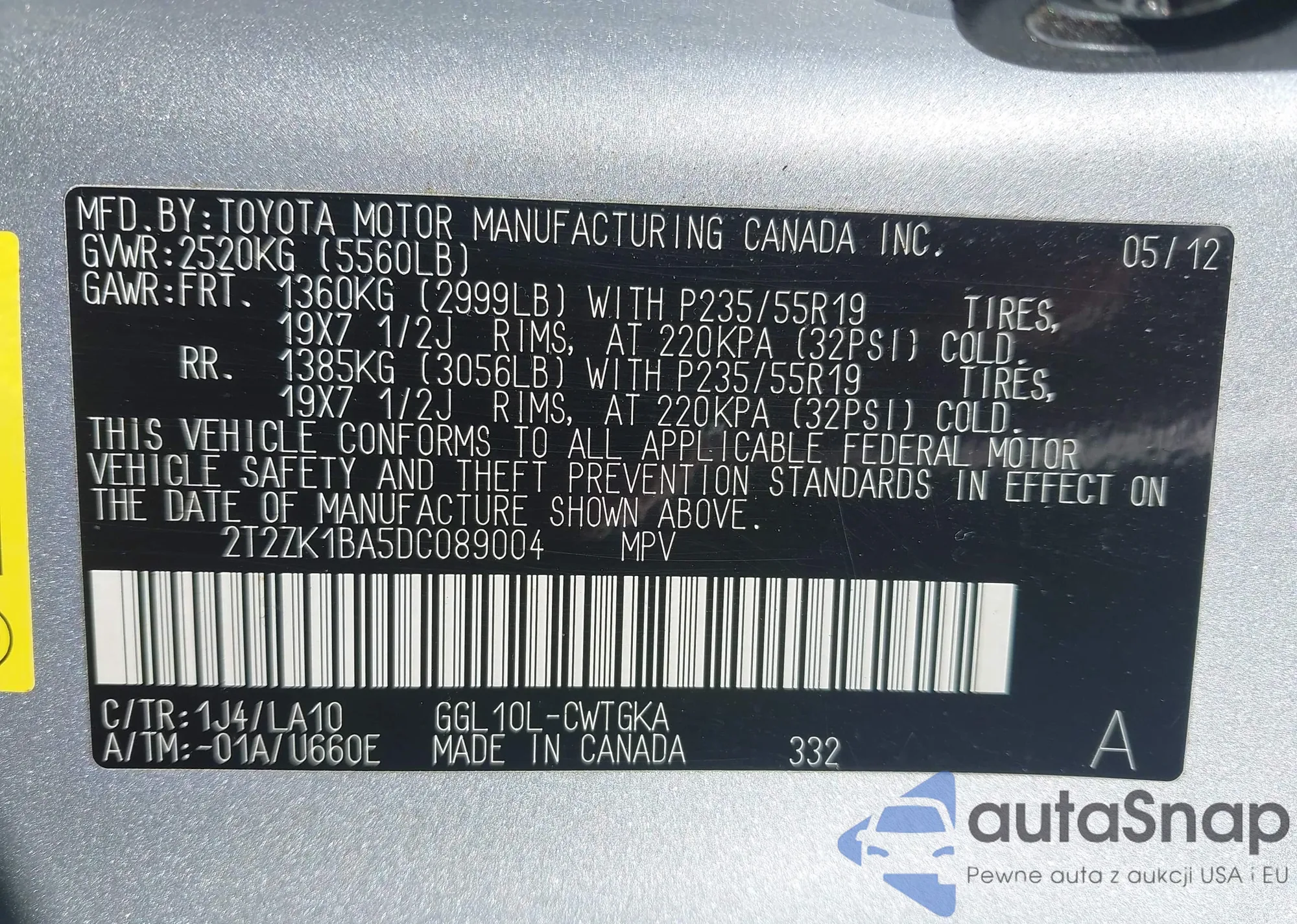VIN: 2T2ZK1BA5DC089004
